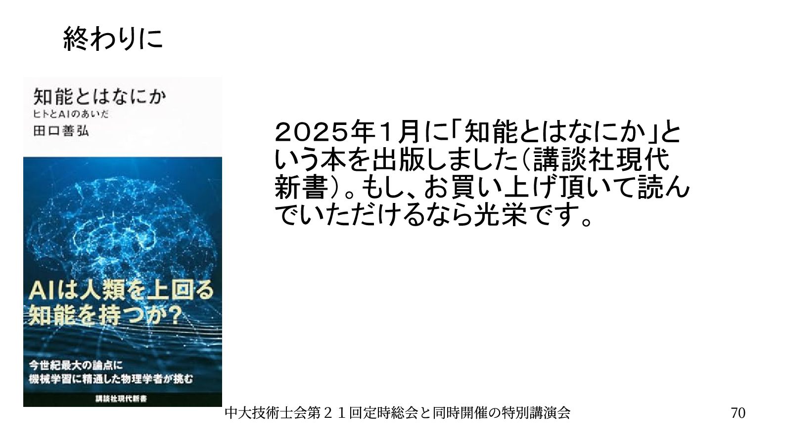 中大技術士会第21回定時総会と同時開催の特別講演会 70 終わりに 2025年1月に「知能とはなにか」と いう本を出版しました(講談社現代 新書)。もし、お買い上げ頂いて読ん でいただけるなら光栄です。