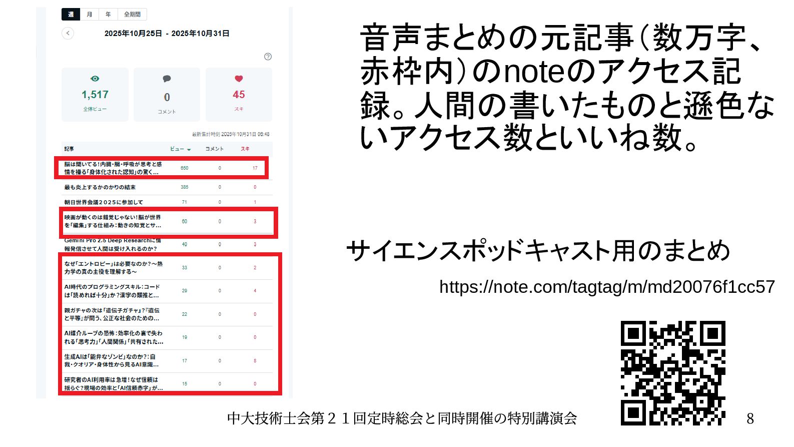 中大技術士会第21回定時総会と同時開催の特別講演会 8 音声まとめの元記事(数万字、 赤枠内)のnoteのアクセス記 録。人間の書いたものと遜色な いアクセス数といいね数。 https://note.com/tagtag/m/md20076f1cc57 サイエンスポッドキャスト用のまとめ