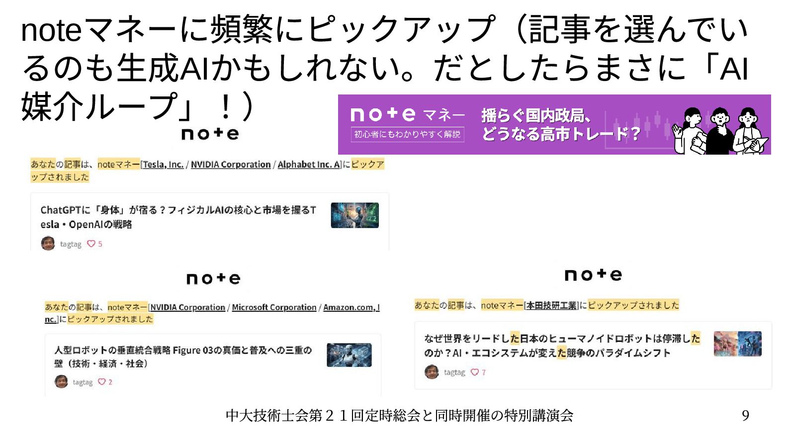 中大技術士会第21回定時総会と同時開催の特別講演会 9 note マネーに頻繁にピックアップ(記事を選んでい るのも生成AI かもしれない。だとしたらまさに「AI 媒介ループ」!)