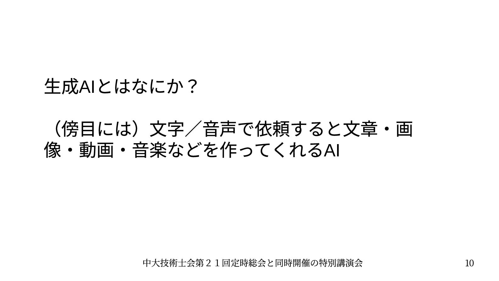 中大技術士会第21回定時総会と同時開催の特別講演会 10 生成AI とはなにか? (傍目には)文字/音声で依頼すると文章・画 像・動画・音楽などを作ってくれるAI