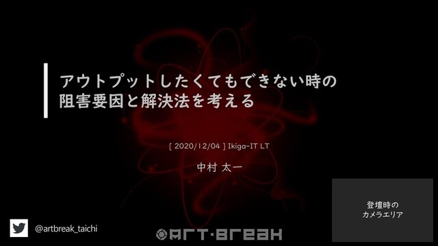 登壇時の カメラエリア アウトプットしたくてもできない時の 阻害要因と解決法を考える [ 2020/12/04 ] Ikiga-IT LT 中村