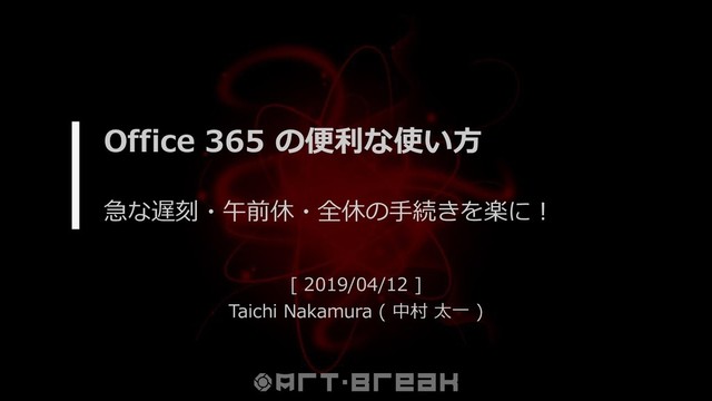 に3項目だけ入力 緊急勤怠連絡者 【3】 Outlook の予 定表に入力 【4】 チームメン バーに Microsoft Teams で連絡 【5】 Microsoft To- Do に勤怠シ ステムに事後 申請をするタ スクを追加 Microsoft Flow 【2】 上司に丁寧な 文章のメール を送信して連 絡 【6】 OneDrive for Business にあ る Excel に データを入力 たった 1アクション! データを貯めれ ば、 Power BI で可視化できる オマケ機能。