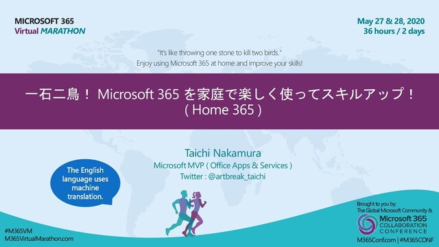 hours / 2 days #M365VM M365VirtualMarathon.com 一石二鳥! Microsoft 365 を家庭で楽しく使ってスキルアップ! ( Home 365 ) Taichi Nakamura Microsoft MVP ( Office Apps & Services ) Twitter : @artbreak_taichi Brought to you by: The Global Microsoft Community & M365Conf.com | #M365CONF "It's like throwing one stone to kill two birds." Enjoy using Microsoft 365 at home and improve your skills!