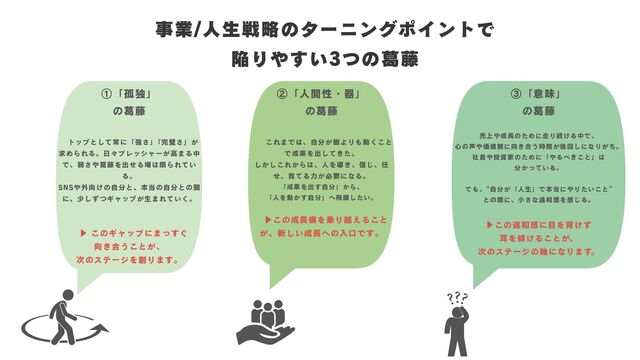 このギャップにまっすぐ 向き合うことが、 次のステージを創ります。 ③「意味」 の葛藤 売上や成長のために走り続ける中で、 心の声や価値観に向き合う時間が後回しになりがち。 社員や投資家のために「やるべきこと」は 分かっている。 でも、“自分が「人生」で本当にやりたいこと” との間に、小さな違和感を感じる。 ▶︎この違和感に目を背けず 耳を傾けることが、 次のステージの軸になります。 ②「人間性・器」 の葛藤 これまでは、自分が誰よりも動くこと で成果を出してきた。 しかしこれからは、人を導き、信じ、任 せ、育てる力が必要になる。 「成果を出す自分」から、 「人を動かす自分」へ飛躍したい。 ▶︎この成長痛を乗り越えること が、新しい成長への入口です。 事業/人生戦略のターニングポイントで 陥りやすい3つの葛藤