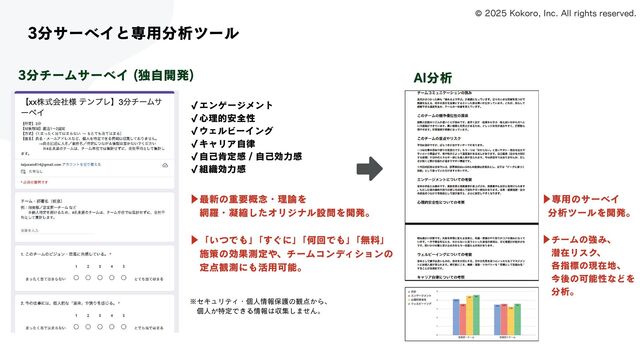 ©2025Kokoro,Inc.Allrightsreserved. 3分サーベイと専⽤分析ツール 3分チームサーベイ(独⾃開発) AI分析 ✔エンゲージメント ✔⼼理的安全性 ✔ウェルビーイング ✔キャリア⾃律 ✔⾃⼰肯定感/⾃⼰効⼒感 ✔組織効⼒感