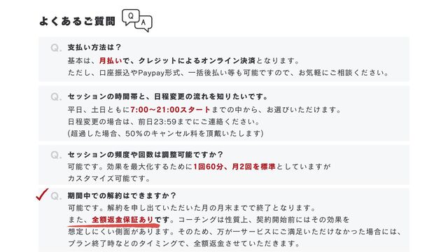可能です。解約を申し出ていただいた月の月末までで終了となります。 また、全額返金保証ありです。コーチングは性質上、契約開始前にはその効果を 想定しにくい側面があります。そのため、万が一サービスにご満足いただけなかった場合には、 プラン終了時などのタイミングで、全額返金させていただきます。 期間中での解約はできますか? Q. 可能です。効果を最大化するために1回60分、月2回を標準としていますが カスタマイズ可能です。 セッションの頻度や回数は調整可能ですか? Q.