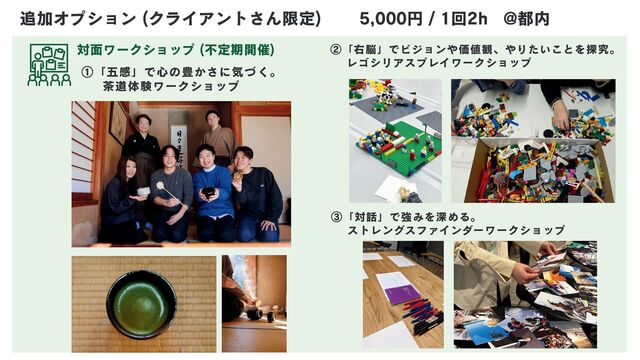 茶道体験ワークショップ ②「右脳」でビジョンや価値観、やりたいことを探究。 レゴシリアスプレイワークショップ ③「対話」で強みを深める。 ストレングスファインダーワークショップ