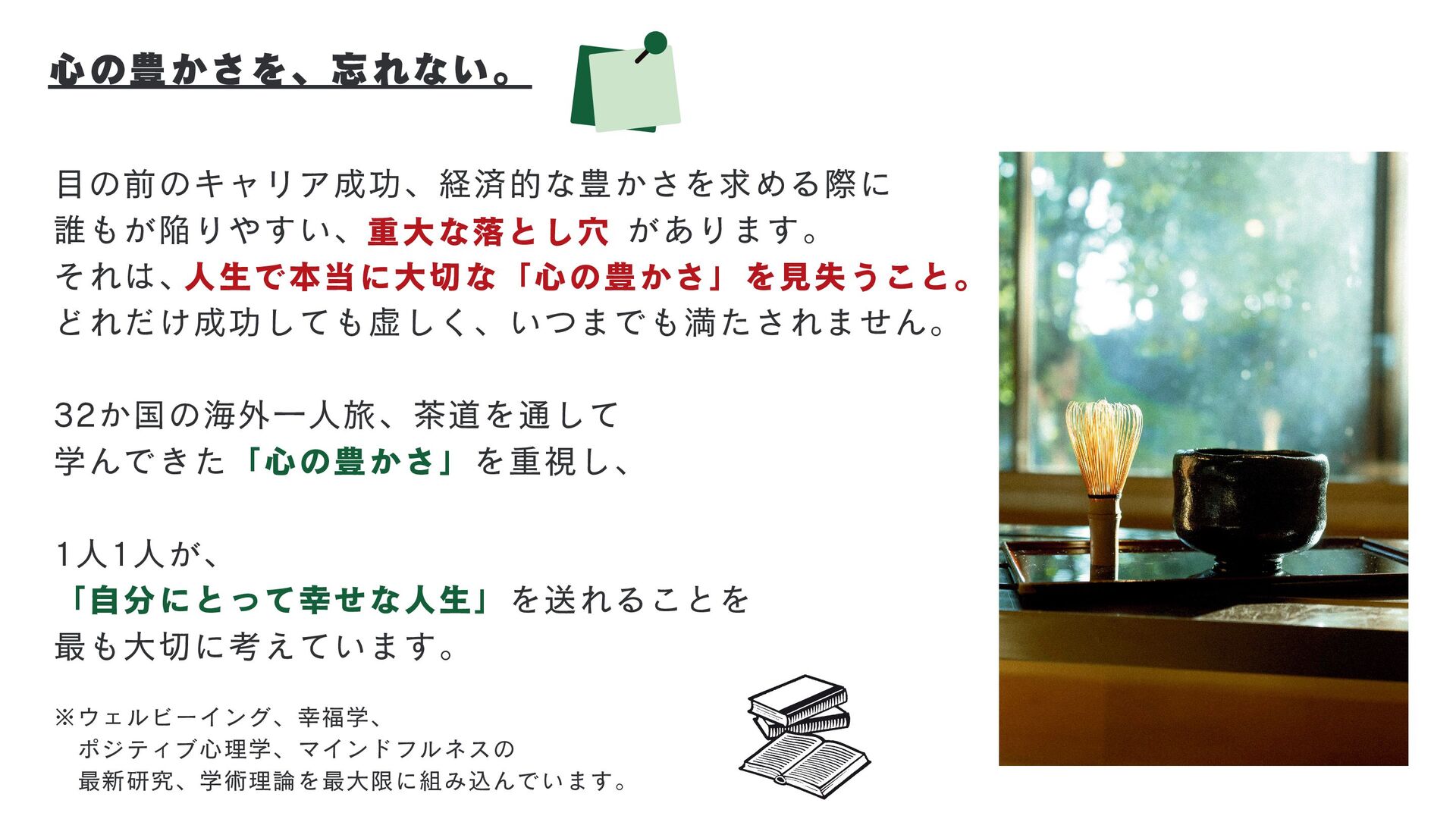 最も大切に考えています。 ※ウェルビーイング、幸福学、 ポジティブ心理学、マインドフルネスの 最新研究、学術理論を最大限に組み込んでいます。 心の豊かさを、忘れない。 重大な落とし穴 人生で本当に大切な「心の豊かさ」を見失うこと。