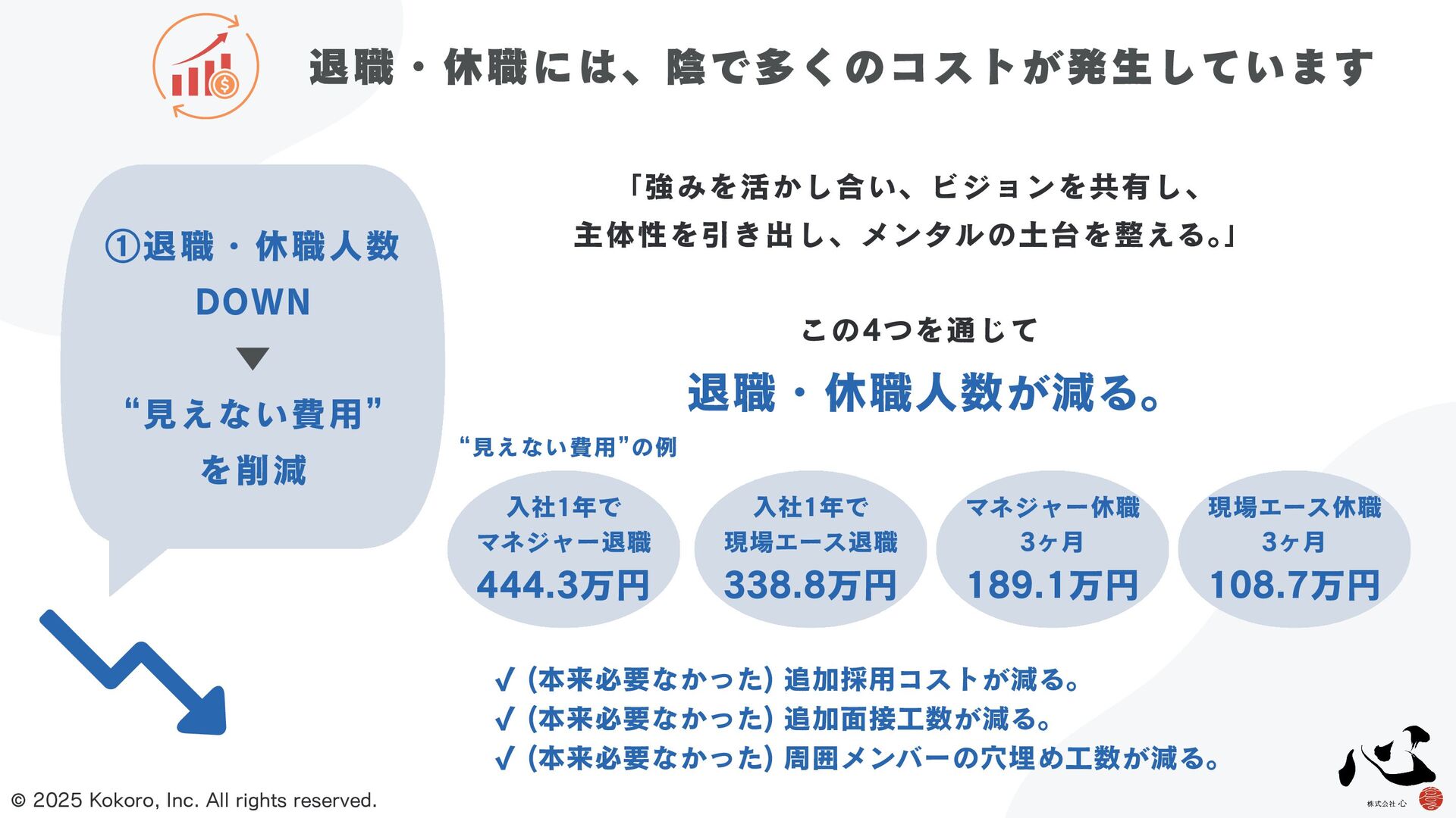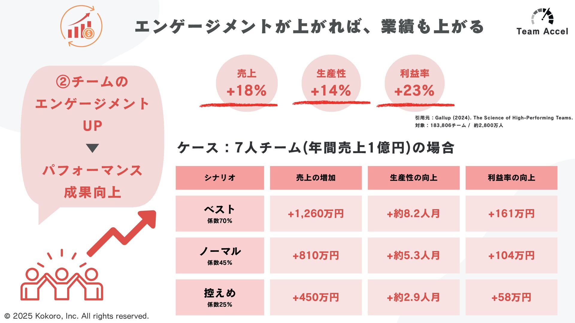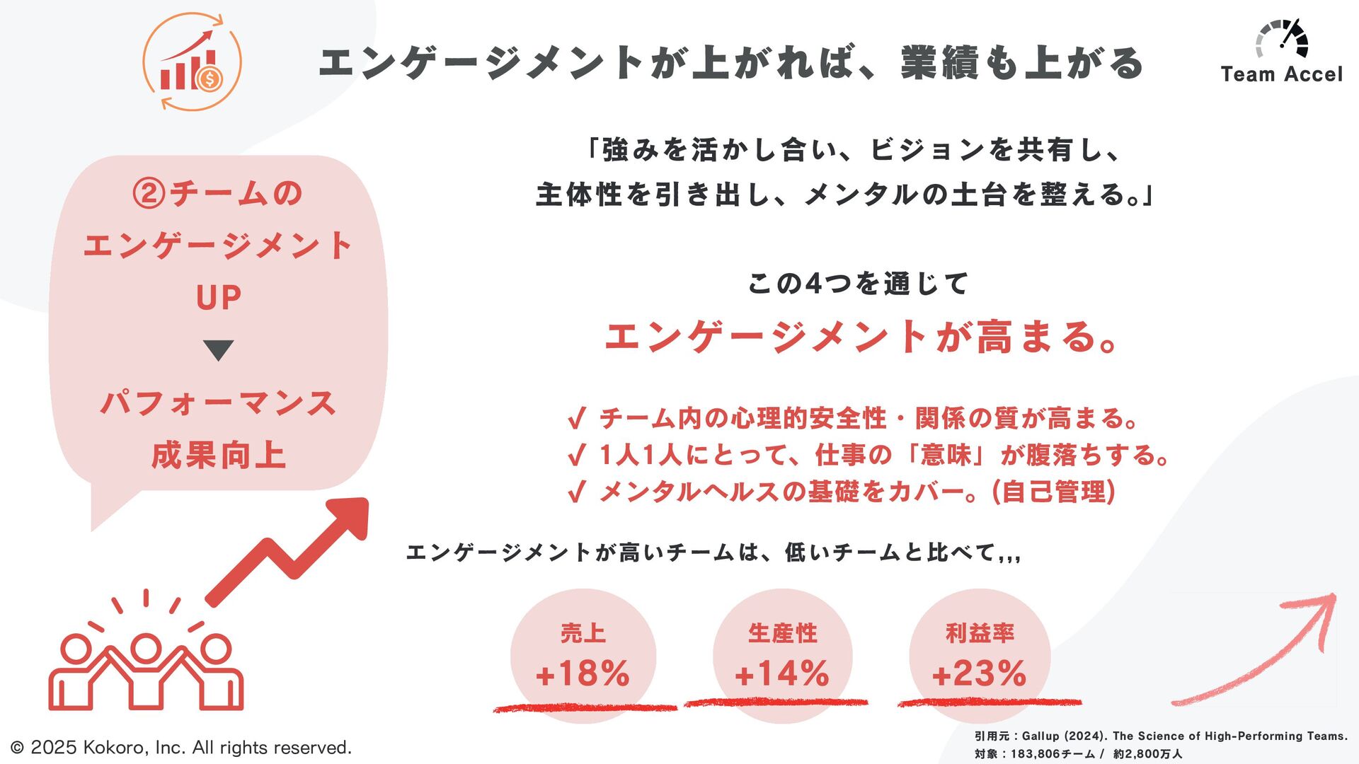 +23% 生産性 +14% ✔ チーム内の心理的安全性・関係の質が高まる。 ✔ 1人1人にとって、仕事の「意味」が腹落ちする。 ✔ メンタルヘルスの基礎をカバー。(自己管理) 「強みを活かし合い、ビジョンを共有し、 主体性を引き出し、メンタルの土台を整える。 」 この4つを通じて 引用元:Gallup (2024). The Science of High-Performing Teams. 対象:183,806チーム / 約2,800万人 エンゲージメントが高いチームは、低いチームと比べて,,, エンゲージメントが高まる。 © 2025 Kokoro, Inc. All rights reserved. Team Accel