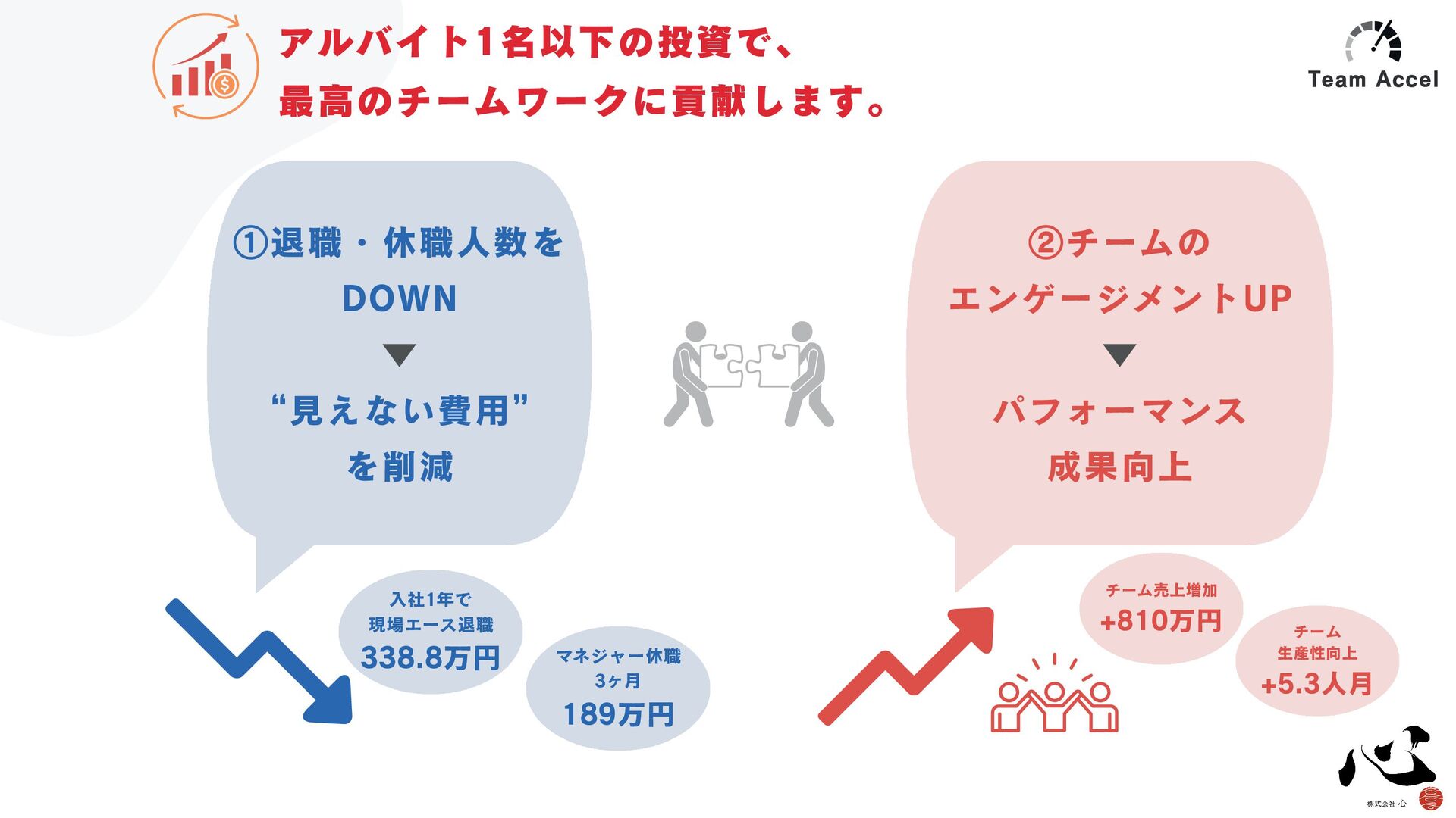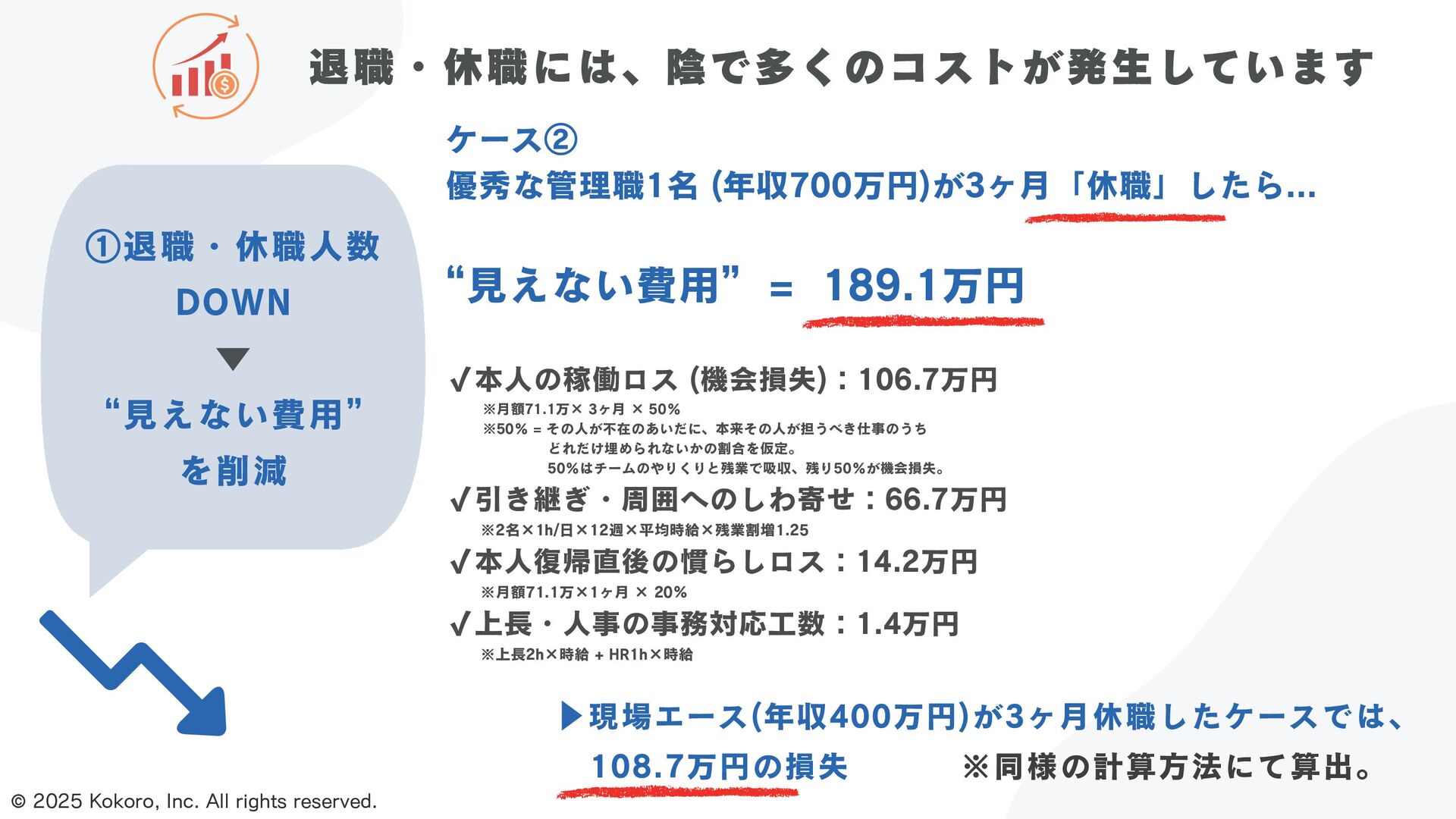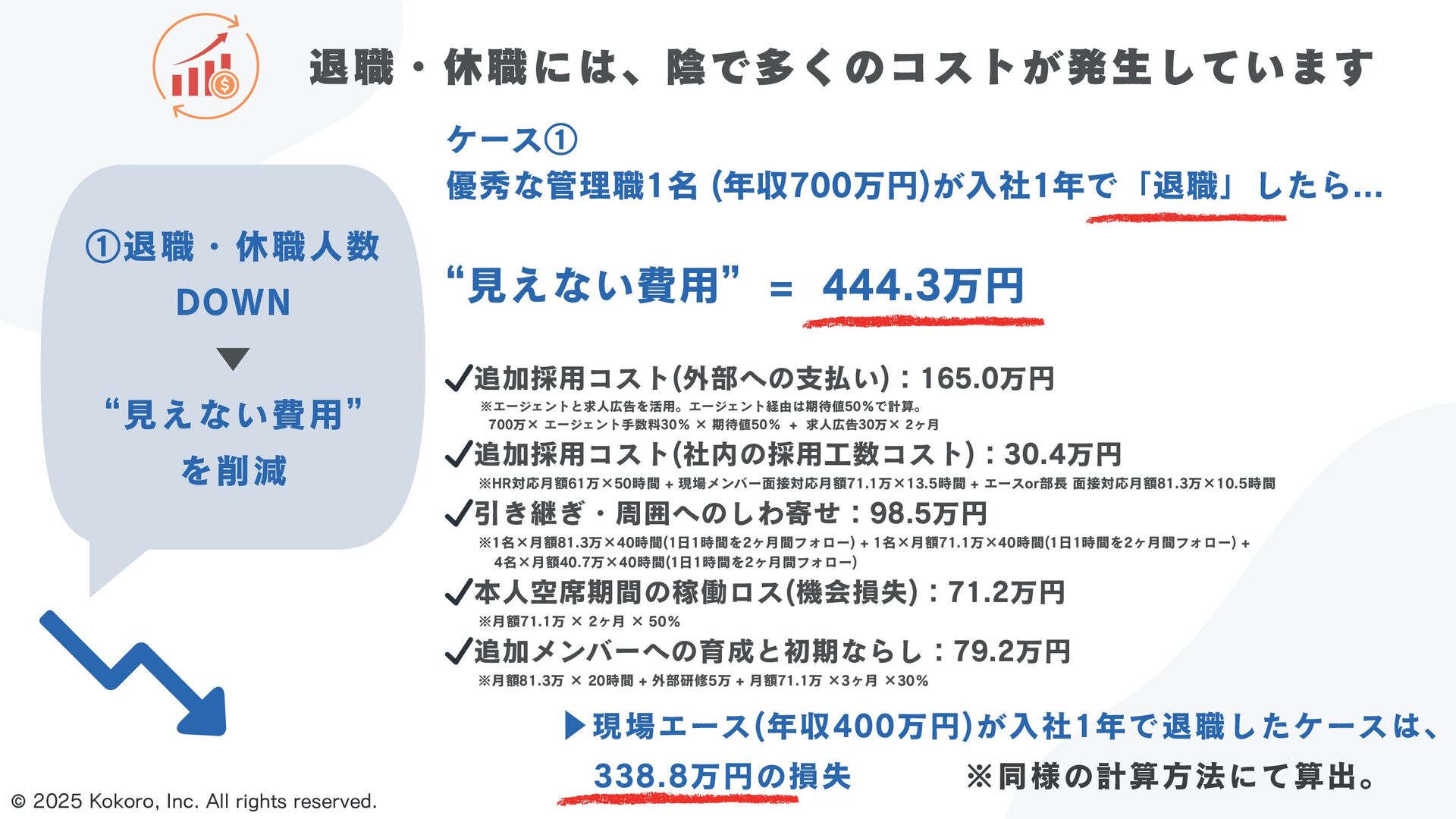 +23% 生産性 +14% ✔ チーム内の心理的安全性・関係の質が高まる。 ✔ 1人1人にとって、仕事の「意味」が腹落ちする。 ✔ メンタルヘルスの基礎をカバー。(自己管理) 「強みを活かし合い、ビジョンを共有し、 主体性を引き出し、メンタルの土台を整える。 」 この4つを通じて 引用元:Gallup (2024). The Science of High-Performing Teams. 対象:183,806チーム / 約2,800万人 エンゲージメントが高いチームは、低いチームと比べて,,, エンゲージメントが高まる。 © 2025 Kokoro, Inc. All rights reserved. Team Accel