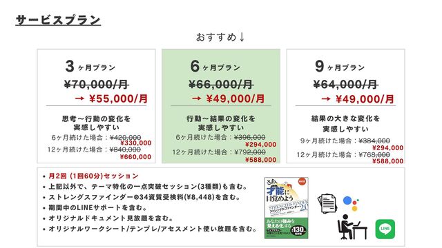 期間中のLINEサポートを含む。 オリジナルドキュメント見放題を含む。 オリジナルワークシート/テンプレ/アセスメント使い放題を含む。 サービスプラン ヶ月プラン ¥70,000/月 ヶ月プラン ¥66,000/月 ヶ月プラン ¥64,000/月 おすすめ↓ 6ヶ月続けた場合:¥420,000 9ヶ月続けた場合:¥384,000 6ヶ月続けた場合:¥396,000 12ヶ月続けた場合:¥840,000 12ヶ月続けた場合:¥792,000 12ヶ月続けた場合:¥768,000 3 6 9 → ¥49,000/月 → ¥49,000/月 ¥294,000 ¥588,000 ¥294,000 ¥588,000 → ¥55,000/月 ¥330,000 ¥660,000