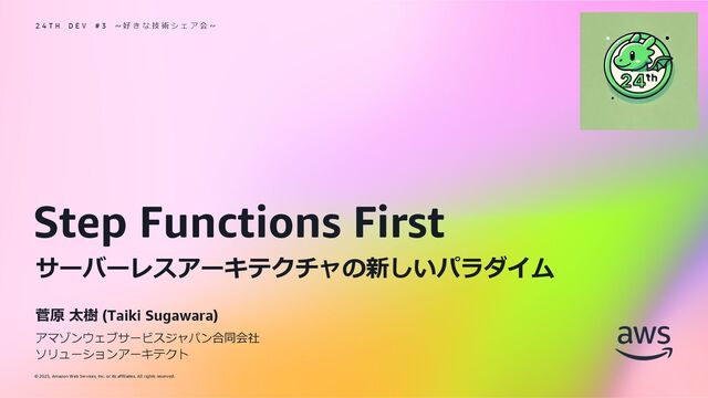 rights reserved. From code to workflow 単一のワークフローでさえ Step Functions へ落とし込む価値が 十分にある app.js const AWS = require('aws-sdk'); const docClient = new AWS.DynamoDB.DocumentClient(); async function queryItems(){ try { const data = await docClient.getItem(params).promise() return data } catch (err) { return err } } var params = { "TableName": "reinvent2022!", "Key": { "PK": {"S": "Wardrobe"}, "SK": {"S": ”shoes"} } } exports.handler = async (event, context) => { try { const data = await queryItems() return { body: JSON.stringify(data) } } catch (err) { return { error: err } } }