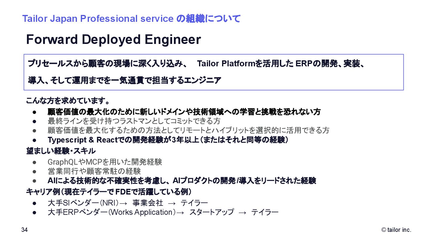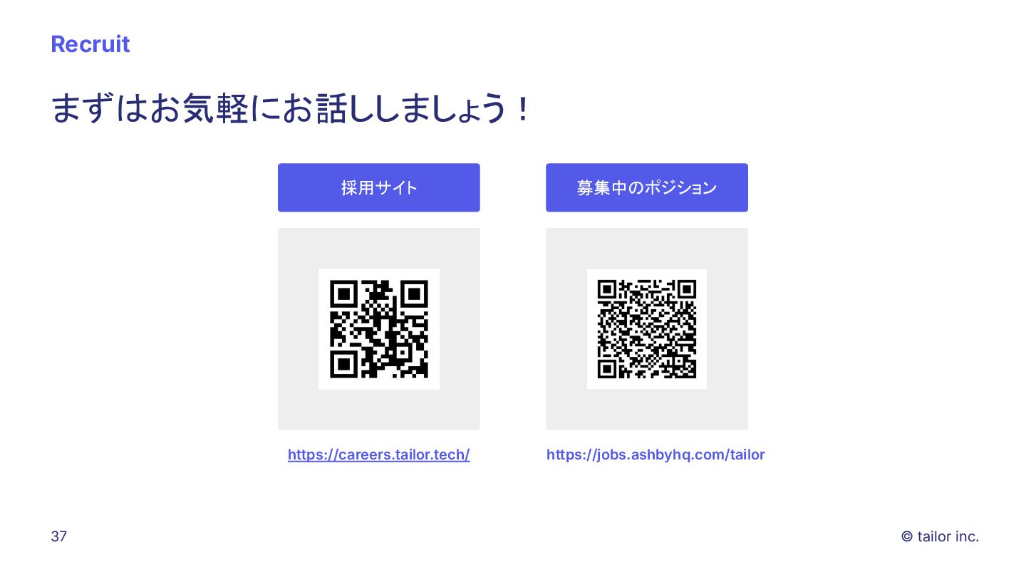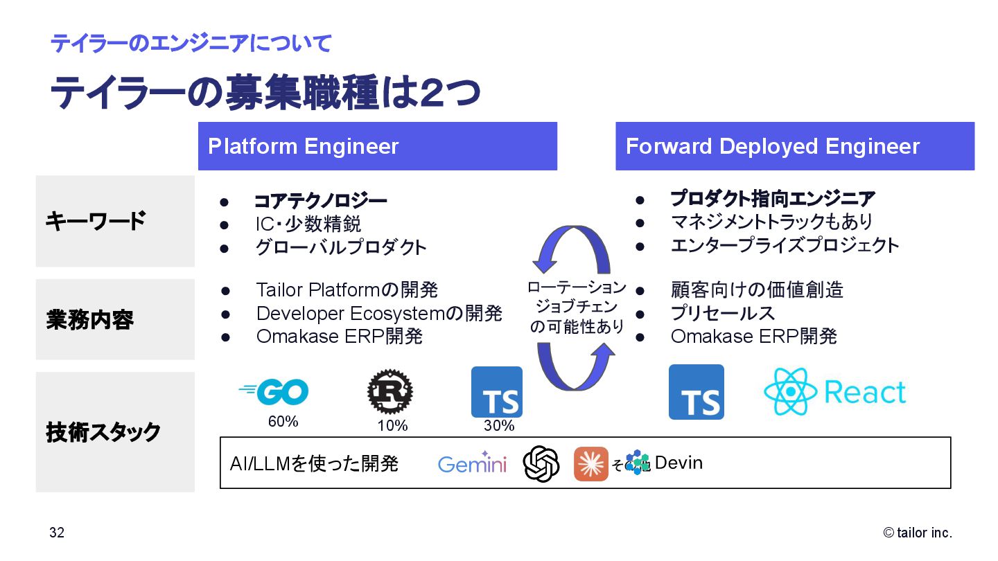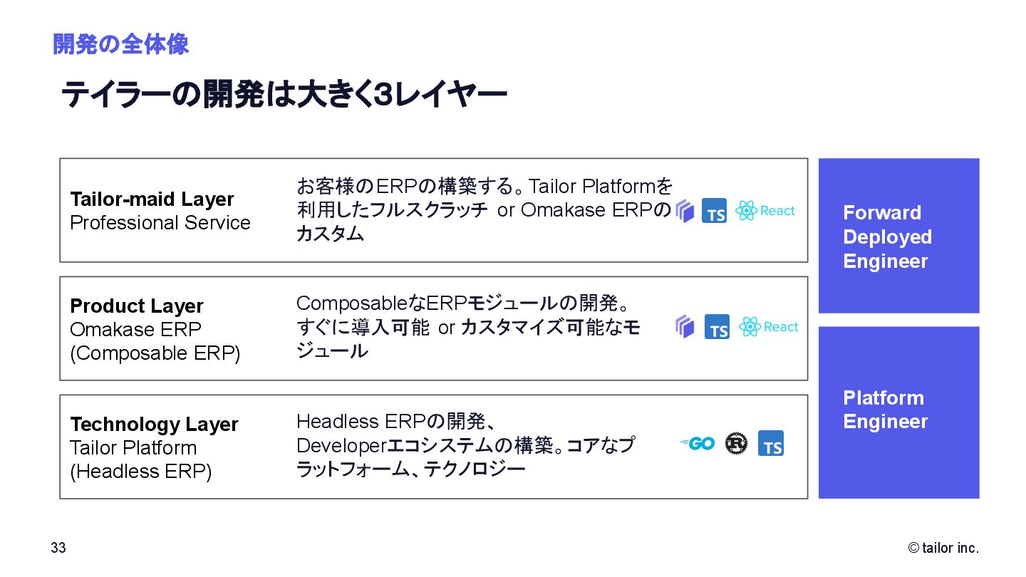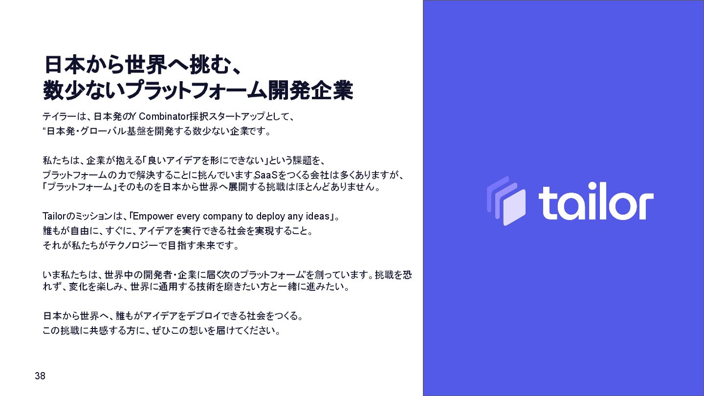 プラットフォームの力で解決することに挑んでいます。 SaaSをつくる会社は多くありますが、 「プラットフォーム」そのものを日本から世界へ展開する挑戦はほとんどありません。 Tailorのミッションは、「Empower every company to deploy any ideas」。 誰もが自由に、すぐに、アイデアを実行できる社会を実現すること。 それが私たちがテクノロジーで目指す未来です。 いま私たちは、世界中の開発者・企業に届く “次のプラットフォーム ”を創っています。挑戦を恐 れず、変化を楽しみ、世界に通用する技術を磨きたい方と一緒に進みたい。 日本から世界へ、誰もがアイデアをデプロイできる社会をつくる。 この挑戦に共感する方に、ぜひこの想いを届けてください。 日本から世界へ挑む、 数少ないプラットフォーム開発企業