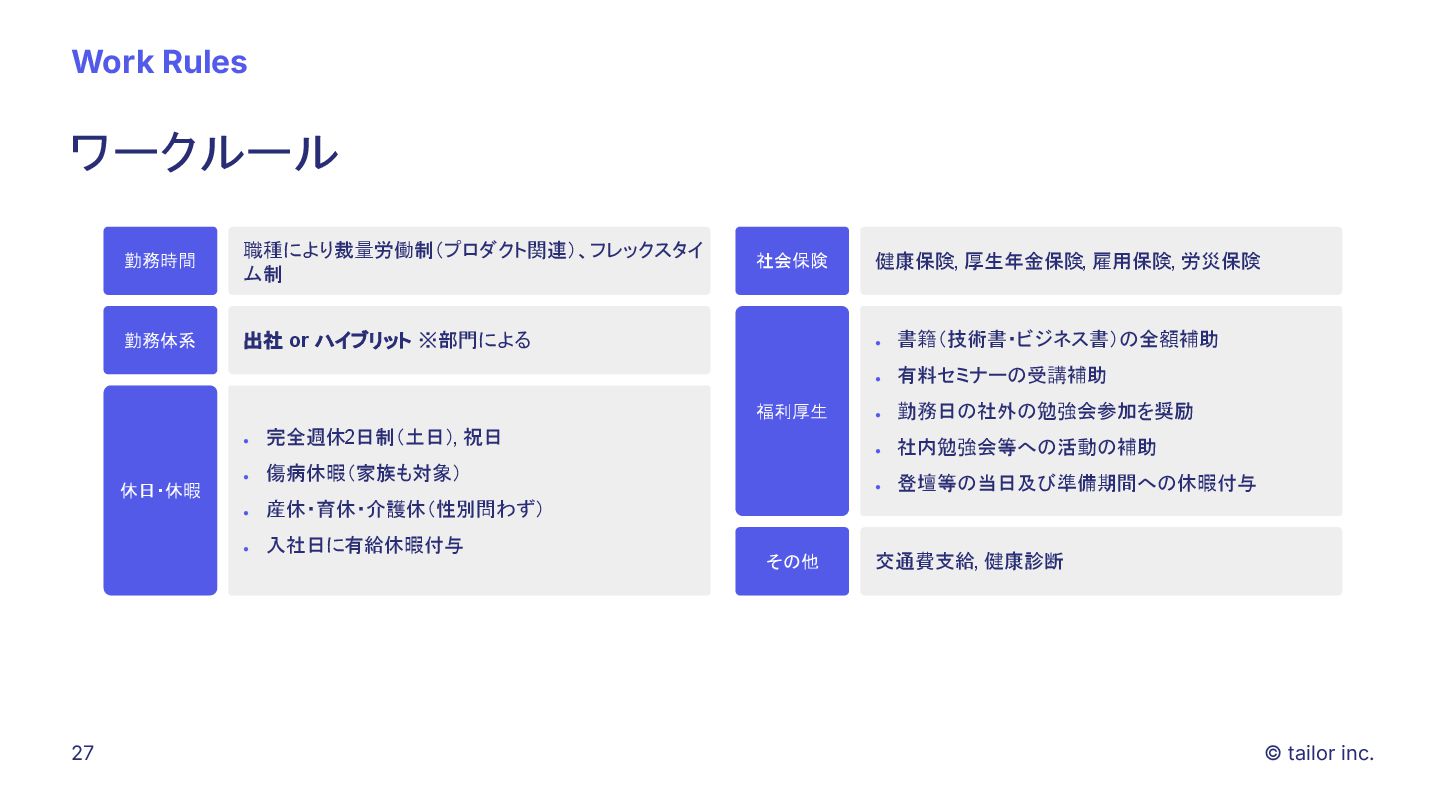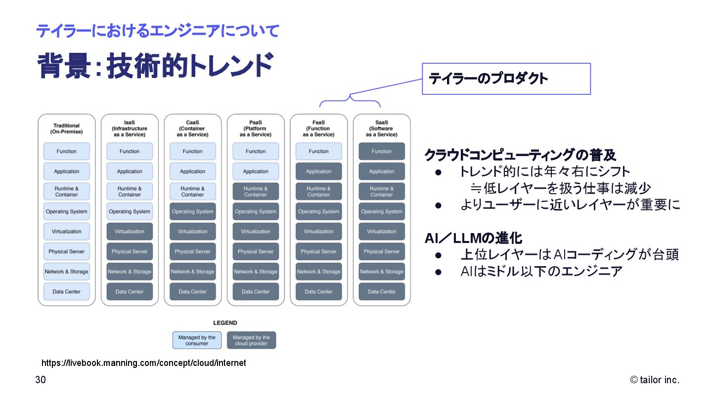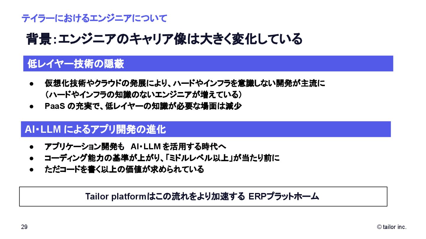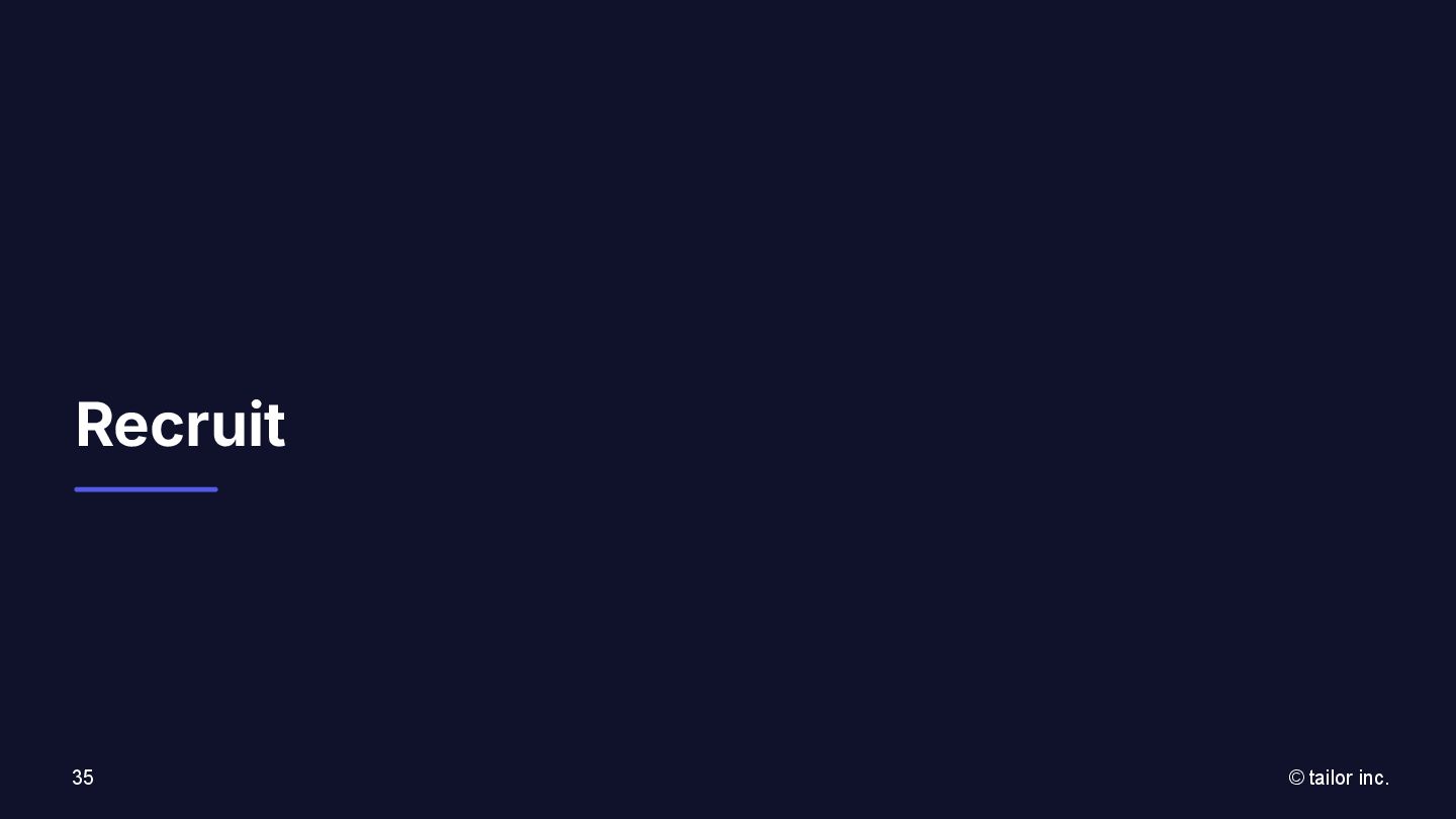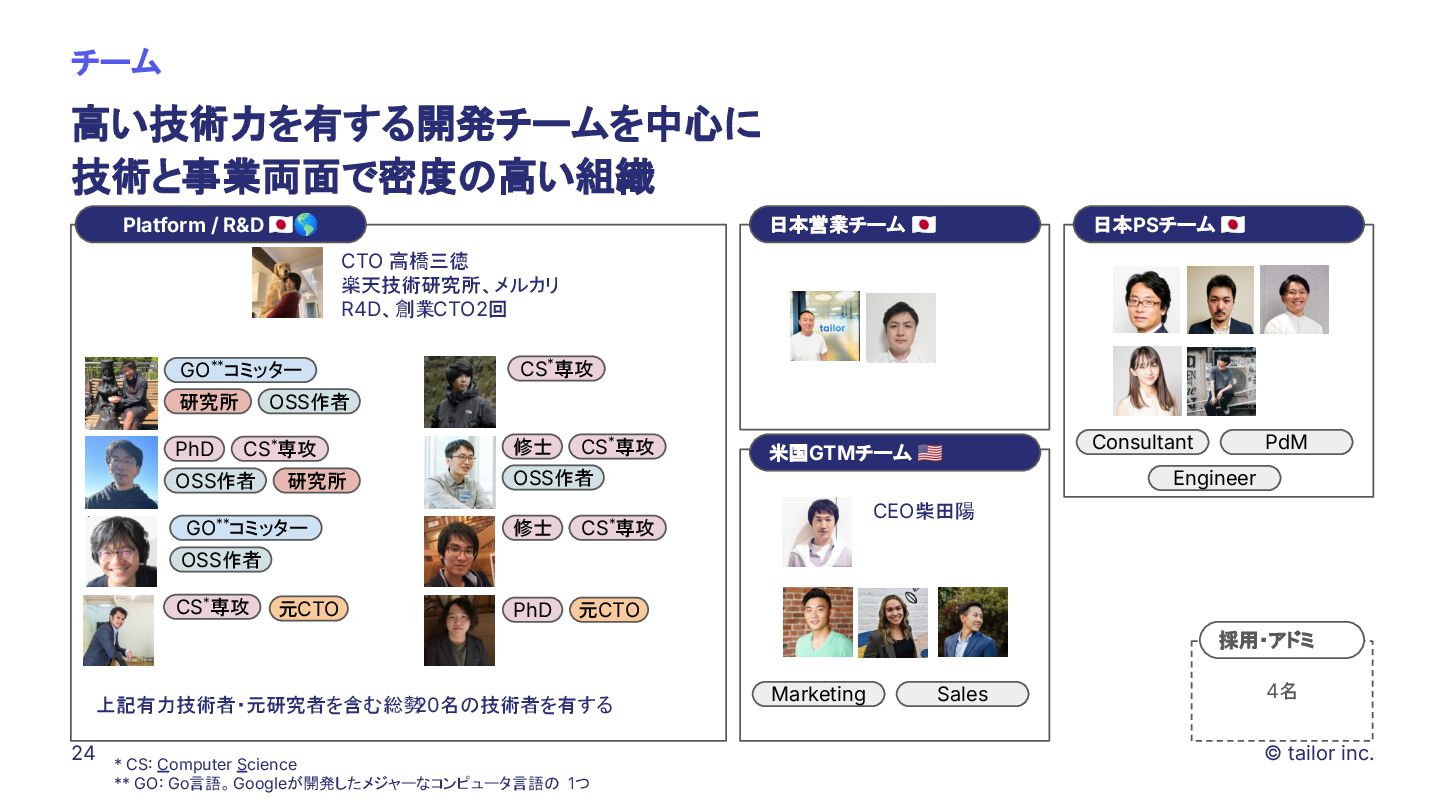プラットフォームの力で解決することに挑んでいます。 SaaSをつくる会社は多くありますが、 「プラットフォーム」そのものを日本から世界へ展開する挑戦はほとんどありません。 Tailorのミッションは、「Empower every company to deploy any ideas」。 誰もが自由に、すぐに、アイデアを実行できる社会を実現すること。 それが私たちがテクノロジーで目指す未来です。 いま私たちは、世界中の開発者・企業に届く “次のプラットフォーム ”を創っています。挑戦を恐 れず、変化を楽しみ、世界に通用する技術を磨きたい方と一緒に進みたい。 日本から世界へ、誰もがアイデアをデプロイできる社会をつくる。 この挑戦に共感する方に、ぜひこの想いを届けてください。 日本から世界へ挑む、 数少ないプラットフォーム開発企業