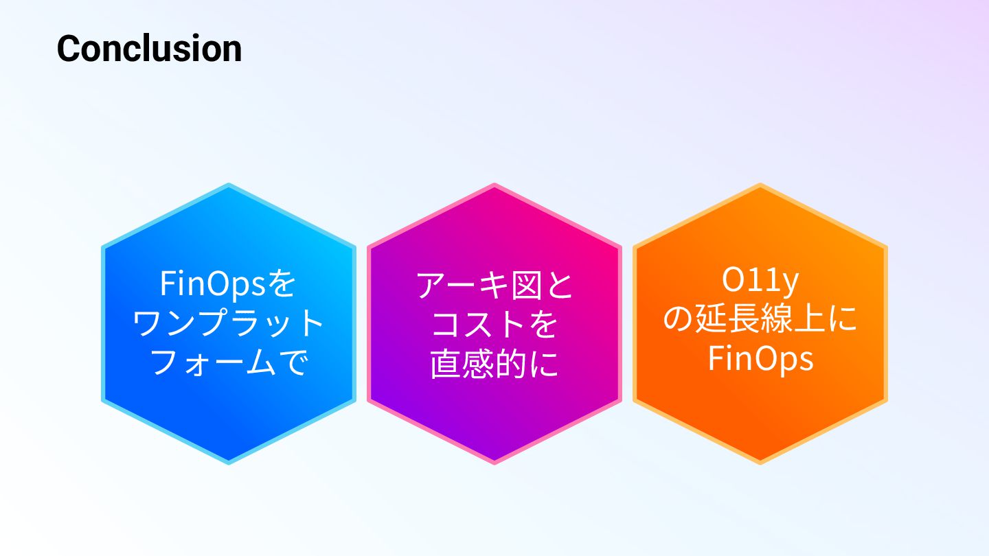 Conclusion FinOpsを ワンプラット フォームで アーキ図と コストを 直感的に O11y の延⻑線上に FinOps