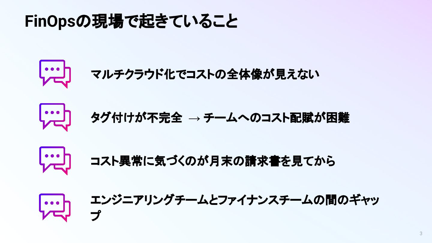 3 FinOpsの現場で起きていること マルチクラウド化でコストの全体像が見えない タグ付けが不完全 → チームへのコスト配賦が困難 コスト異常に気づくのが月末の請求書を見てから エンジニアリングチームとファイナンスチームの間のギャッ プ