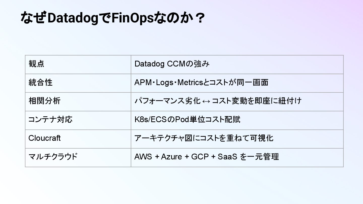 なぜDatadogでFinOpsなのか? 観点 Datadog CCMの強み 統合性 APM・Logs・Metricsとコストが同一画面 相関分析 パフォーマンス劣化 ↔ コスト変動を即座に紐付け