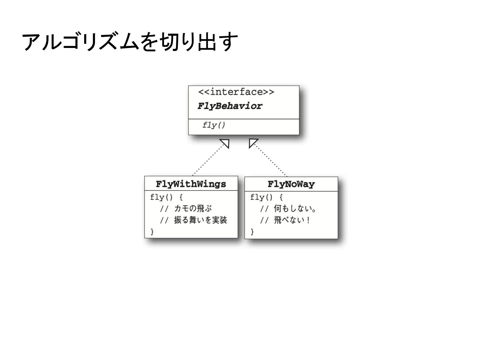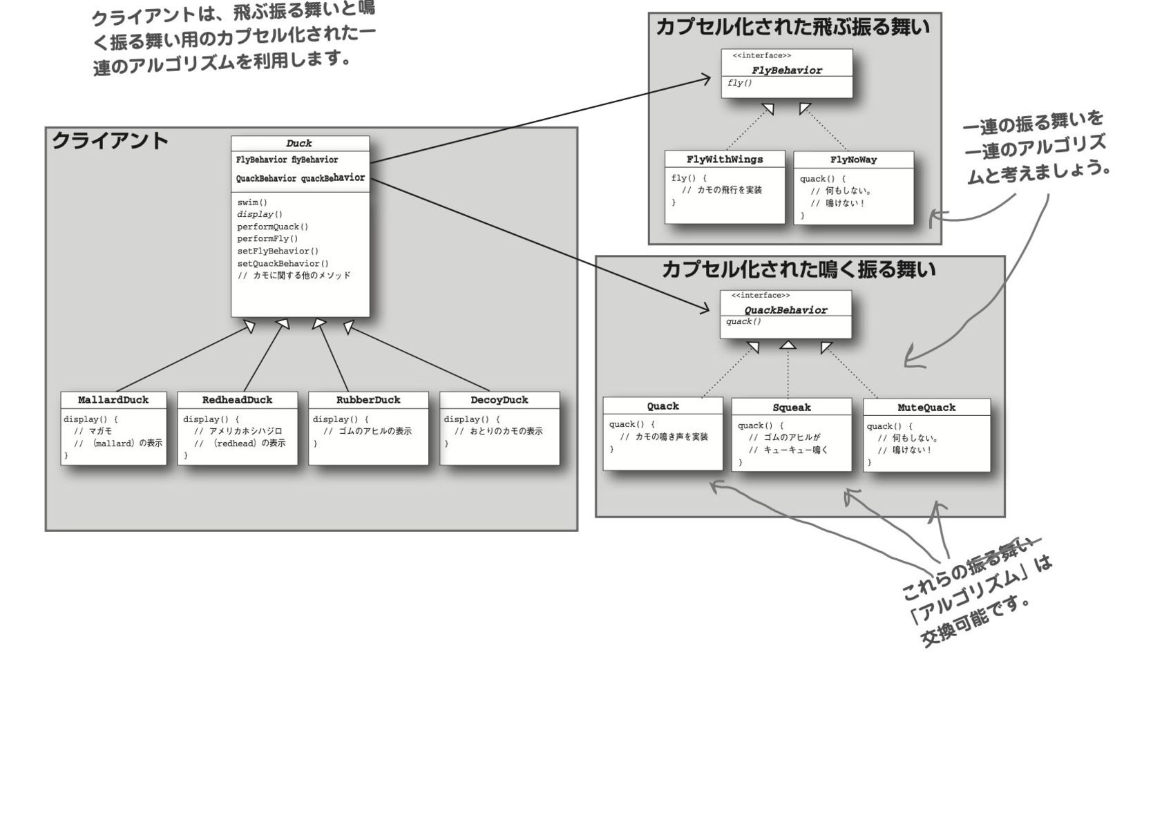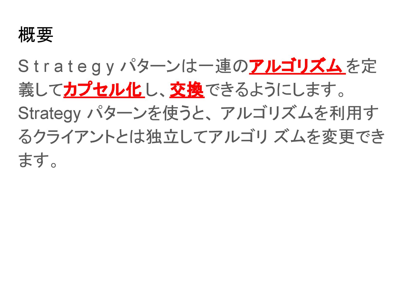 を定 義してカプセル化 し、交換できるようにします。 Strategy パターンを使うと、 アルゴリズムを利用す るクライアントとは独立してアルゴリ ズムを変更でき ます。