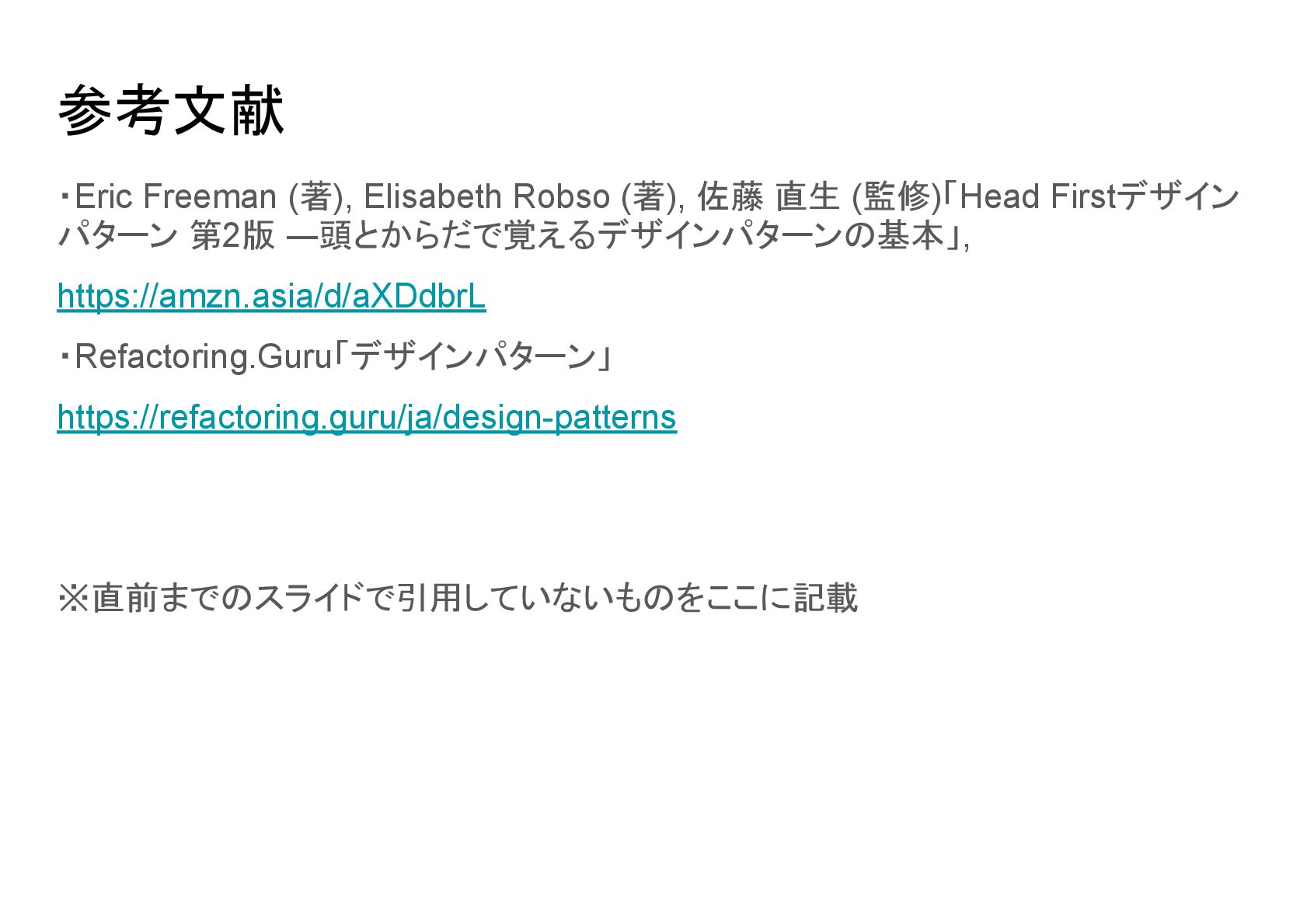 Firstデザイン パターン 第2版 ―頭とからだで覚えるデザインパターンの基本」, https://amzn.asia/d/aXDdbrL ・Refactoring.Guru「デザインパターン」 https://refactoring.guru/ja/design-patterns ※直前までのスライドで引用していないものをここに記載