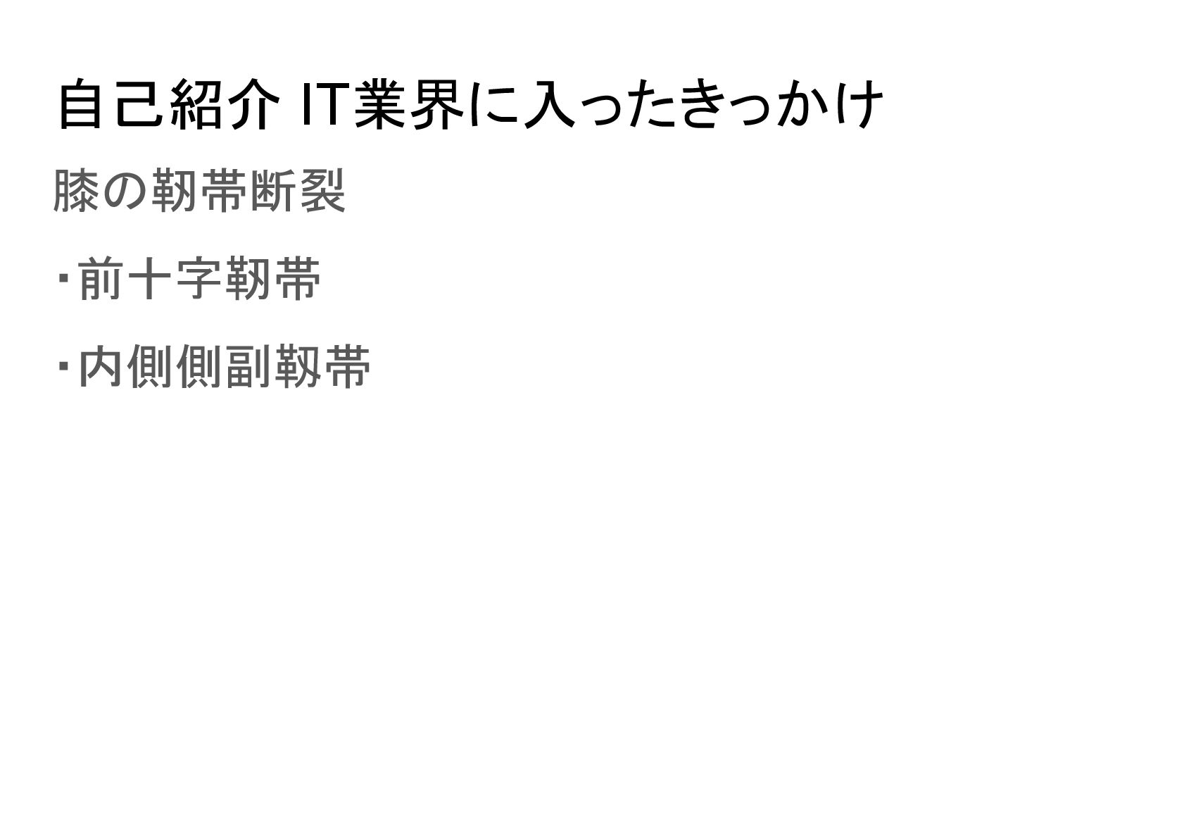 自己紹介 IT業界に入ったきっかけ 膝の靭帯断裂 ・前十字靭帯 ・内側側副靱帯