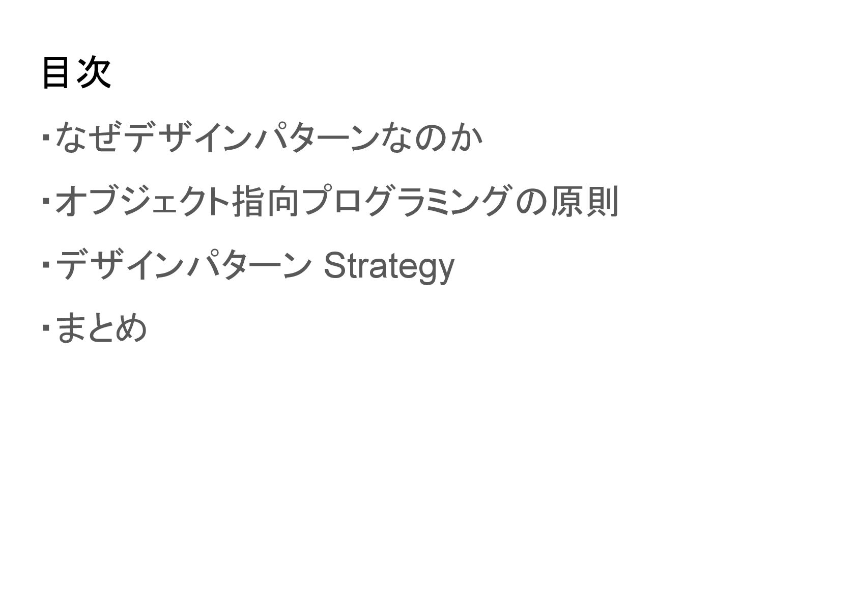 目次 ・なぜデザインパターンなのか ・オブジェクト指向プログラミングの原則 ・デザインパターン Strategy ・まとめ
