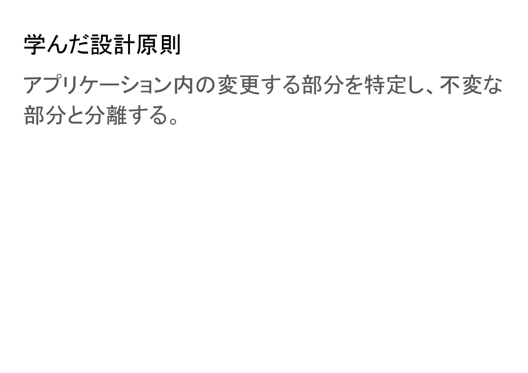 学んだ設計原則 アプリケーション内の変更する部分を特定し、不変な 部分と分離する。