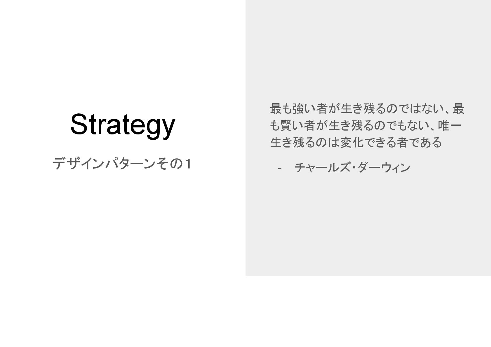 Strategy 最も強い者が生き残るのではない、最 も賢い者が生き残るのでもない、唯一 生き残るのは変化できる者である - チャールズ・ダーウィン デザインパターンその1