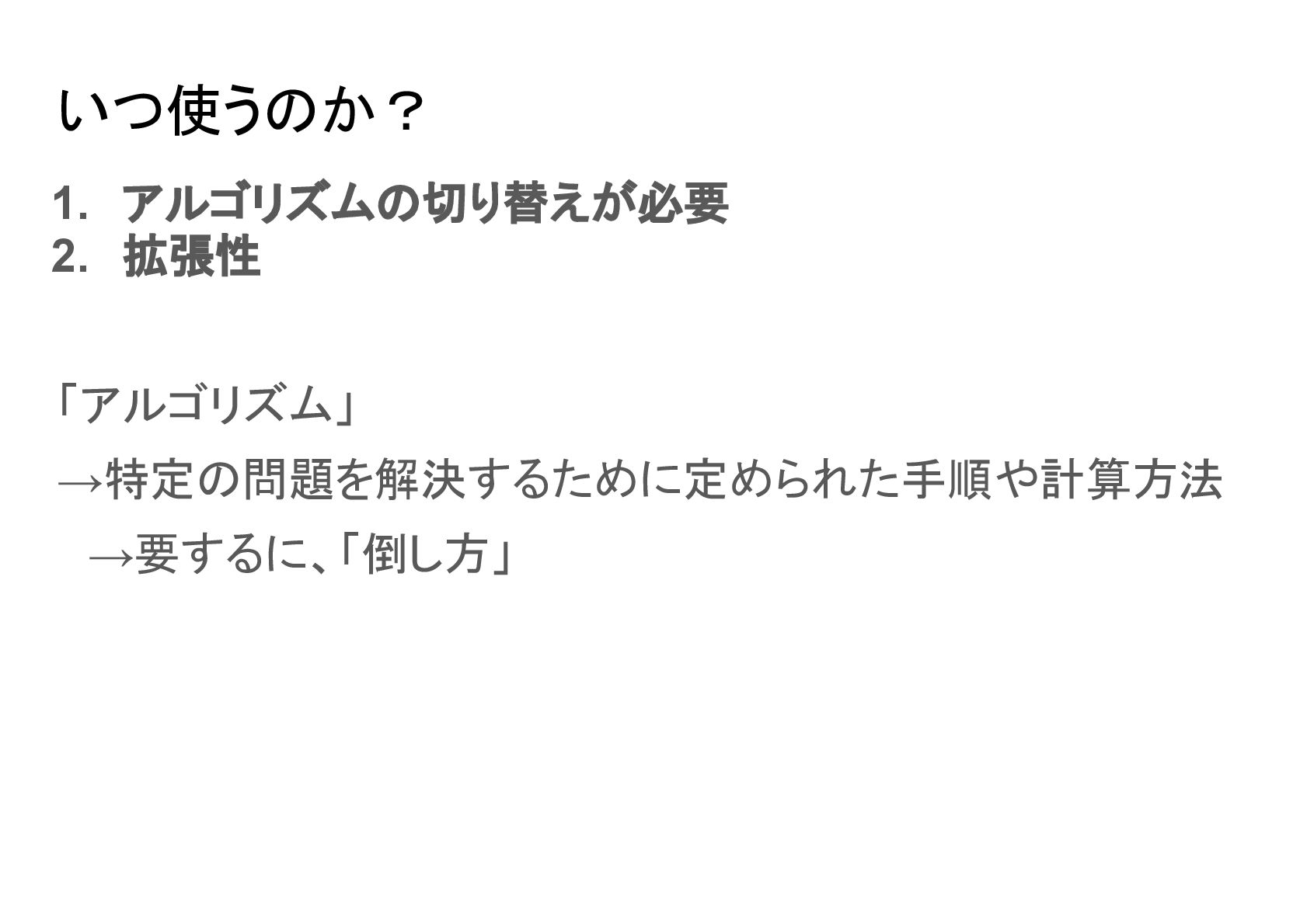いつ使うのか? 1. アルゴリズムの切り替えが必要 2. 拡張性 「アルゴリズム」 →特定の問題を解決するために定められた手順や計算方法 →要するに、「倒し方」