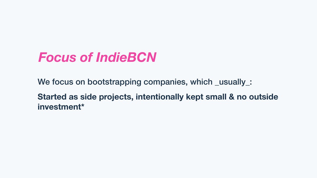 Focus of IndieBCN We focus on bootstrapping companies, which _usually_: