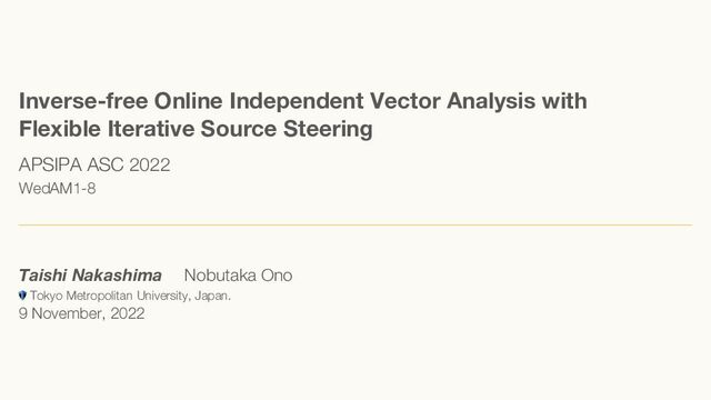 for independent vector analysis based on auxiliary function technique,” in Proceedings of IEEE Workshop on Applications of Signal Processing to Audio and Acoustics (WASPAA), pp. 189–192, 2011. [Scheibler+2020] R. Scheibler and N. Ono, “Fast and stable blind source separation with rank-1 updates,” in Proceedings of IEEE International Conference on Acoustics, Speech and Signal Processing (ICASSP), May 2020. [Taniguchi+2014] T. Taniguchi, N. Ono, A. Kawamura, and S. Sagayama, “An auxiliary-function approach to online independent vector analysis for real-time blind source separation,” in Proceedings of Hands-Free Speech Communication and Microphone Arrays (HSCMA), pp. 107–111, May 2014. Thank you!