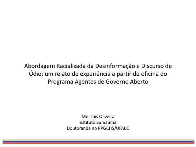 | XI WECSAB | UNEB | Me. Taís Oliveira REFERÊNCIAS BIBLIOGRÁFICAS ABRAMOWITZ, Alan; MCCOY, Jennifer. United States: Racial resentment, negative partisanship, and polarization in Trump’s America. The ANNALS of the American Academy of Political and Social Science, v. 681, n. 1, p. 137-156, 2019. BENJAMNI, Ruha. Retomando nosso fôlego: estudos de Ciência e Tecnologia, Teoria Racial Crítica e a imaginação carcerária. In SILVA, Tarcízio (org). Comunidades, Algoritmos e Ativismos Digitais: olhares afrodiapóricos. LiteraRua: São Paulo, 2020. BENTO, Maria Aparecida Silva. Branqueamento e branquitude no Brasil. Psicologia social do racismo: estudos sobre branquitude e branqueamento no Brasil. Petrópolis: Vozes, p. 5-58, 2002. BRAGA, Renê Morais da Costa. A indústria das Fake News e o discurso de ódio. In: PEREIRA, Rodolfo Viana (Org.). Direitos políticos, liberdade de expressão e discurso de ódio. Volume I. Belo Horizonte: IDDE, 2018. CARNEIRO, Sueli. Racismo, sexismo e desigualdade no Brasil. Selo Negro: São Paulo, 2011. CRENSHAW, K. Documento para o encontro de especialistas em aspectos da discriminação racial relativos ao gênero. Revista Estudos Feministas, v. 10, n.1, p. 171–188, jan. 2002. DANIELS, Jessie; NKONDE, Mutale; MIR, Darakhshan. Advancing racial literacy in tech. Relatório do Data & Society Fellowship Program, 2019. DOMICÍLIOS, T. I. C. Pesquisas e Indicadores-2019. Domicílios com acesso à internet, 2020. FERRÉS, Joan; PISCITELLI, Alejandro. Competência midiática: proposta articulada de dimensões e indicadores. Lumina, v. 9, n. 1, 2015. GONZALEZ, Lélia; HASENBALG, Carlos Alfredo. Lugar de negro. Editora Marco Zero, 1982. ___________, Lélia. Por um feminismo afro-latino-americano: ensaios, intervenções e diálogos. RIOS, Flavia; LIMA, Márcia (Orgs.). 1ª Edição. Zahar: Rio de Janeiro, 2020. LIMA, Dulcilei Conceição et al. Narrativas midiáticas em disputa: informação e contrainformação política no caso Claudia Silva Ferreira. Revista Trama Interdisciplinar, v. 9, n. 2, 2018. MOURA, Clóvis. Dialética radical do Brasil negro. 3ª edição. Anita Garibaldi: São Paulo, 2020. PENTEADO, Claudio Camargo; FORTUNATO, Ivan. Mídia e políticas públicas: possíveis campos exploratórios. Revista Brasileira de Ciências Sociais, v. 30, n. 87, p. 129-142, 2015. RECUERO, Raquel et al. Desinformação, Mídia Social e Covid-19 no Brasil: Relatório, resultados e estratégias de combate. Relatório de Pesquisa. 2020 SANTOS, Caroline da Rosa dos. As Fake News como instrumento de naturalização da morte de pessoas negras envolvendo Agentes do Estado: caso Marielle Franco. Trabalho de Conclusão de Curso (Faculdade de Biblioteconomia e Comunicação da Universidade - Bacharelado em Relações Públicas). Universidade Federal do Rio Grande do Sul, 2019. SIMONDON, Gilbert. Do modo de existência dos objetos técnicos. 1ª Edição. Contraponto: Rio de Janeiro, 2020. TRINDADE, Luiz Valério P. Mídias Sociais e a naturalização de discursos racistas no Brasil. In SILVA, Tarcízio (org). Comunidades, Algoritmos e Ativismos Digitais: olhares afrodiapóricos. LiteraRua: São Paulo, 2020.