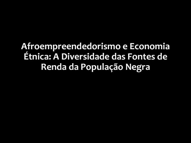Econômica Étnica PROBLEMÁTICAS Não há um marco teórico de Afroempreendedorismo; Empreendedorismo discutido em demasia em campos técnicos; O debate sobre Afroempreendedorismo é interdisciplinar; Empreendedorismo por necessidade versus por oportunidade; Criticar a repetição da lógica do sistema e o esvaziamento de discurso político; Políticas Públicas de incentivo; Escalabidade e possibilidade de sobrevivência (negócio); Black Money nos EUA versus Black Money no Brasil (Texto de Suzane Jardim). Para debater Economia Étnica no Brasil deve-se levar em consideração a história;