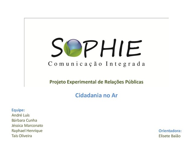 Apresentação do trabalho de conclusão de curso em Relações Públicas (FAPCOM, 2011). A Agência Sophie desenvolveu uma plano de comunicação integrada para a ONG Cidadania no Ar.