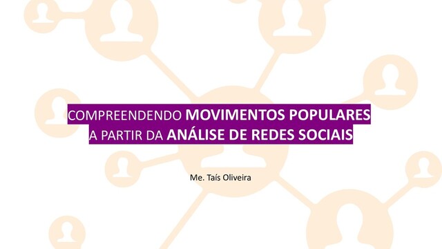 articulação de muitos grupos, dentre os quais os movimentos sociais. Castells (2009) considera esses movimentos como grupos de atores sociais que aspiram mudanças na sociedade e que buscam resistir às instituições políticas quando essas se mostram “injustas, imorais e, em última instância, ilegítimas” (CASTELLS, 2009, p. 394, tradução nossa) e assim pretendem transformar a indignação em ato político. Compreendendo Movimentos Populares a partir da Análise de Redes Sociais | Me. Taís Oliveira