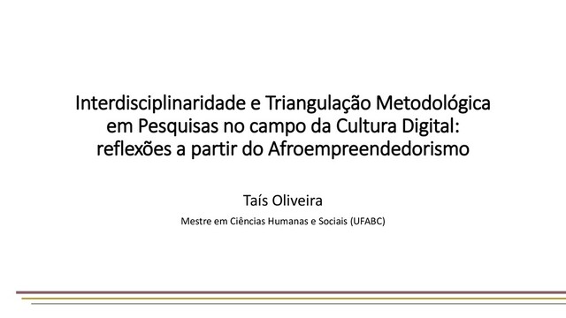 Digital: reflexões a partir do Afroempreendedorismo | M.ª Taís Oliveira | Intercom 2019 O artigo tem como objetivo discutir os percursos teóricos interdisciplinares e a opção pela triangulação metodológica no aprofundamento de investigação baseada em identidades no campo da cultura digital. OBJETIVO