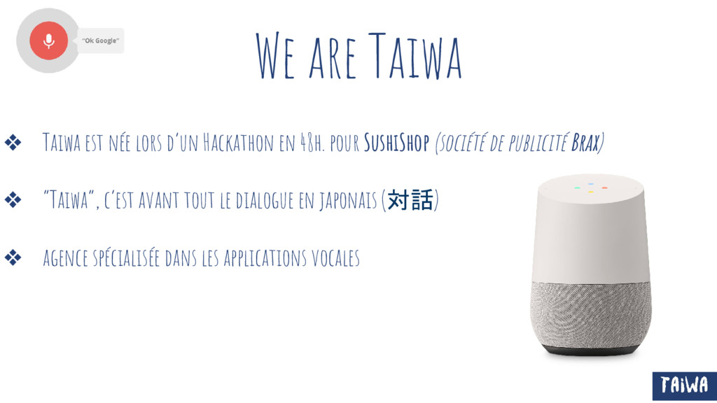 en 48h. pour SushiShop (société de publicité Brax) ❖ “Taiwa”, c’est avant tout le dialogue en japonais (対話) ❖ agence spécialisée dans les applications vocales