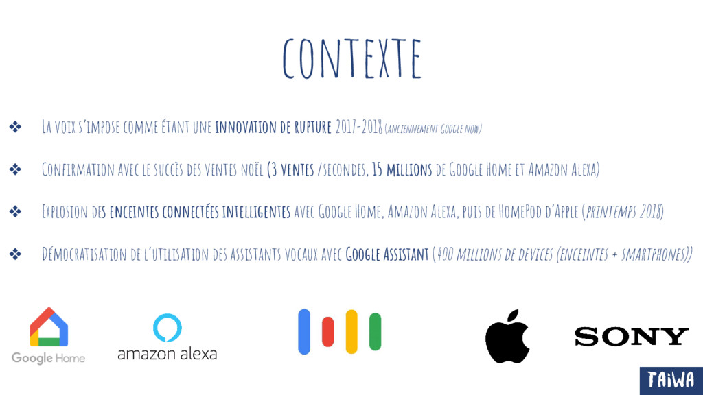 rupture 2017-2018 (anciennement Google now) ❖ Confirmation avec le succès des ventes noël (3 ventes /secondes, 15 millions de Google Home et Amazon Alexa) ❖ Explosion des enceintes connectées intelligentes avec Google Home, Amazon Alexa, puis de HomePod d’Apple (printemps 2018) ❖ Démocratisation de l’utilisation des assistants vocaux avec Google Assistant (400 millions de devices (enceintes + smartphones))