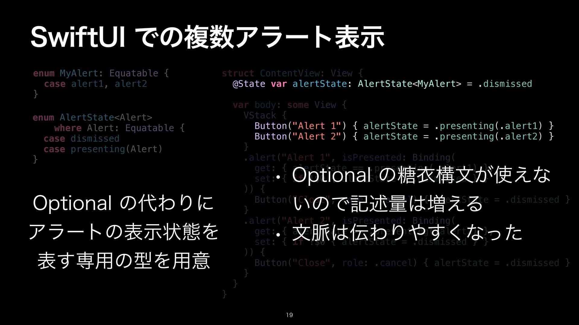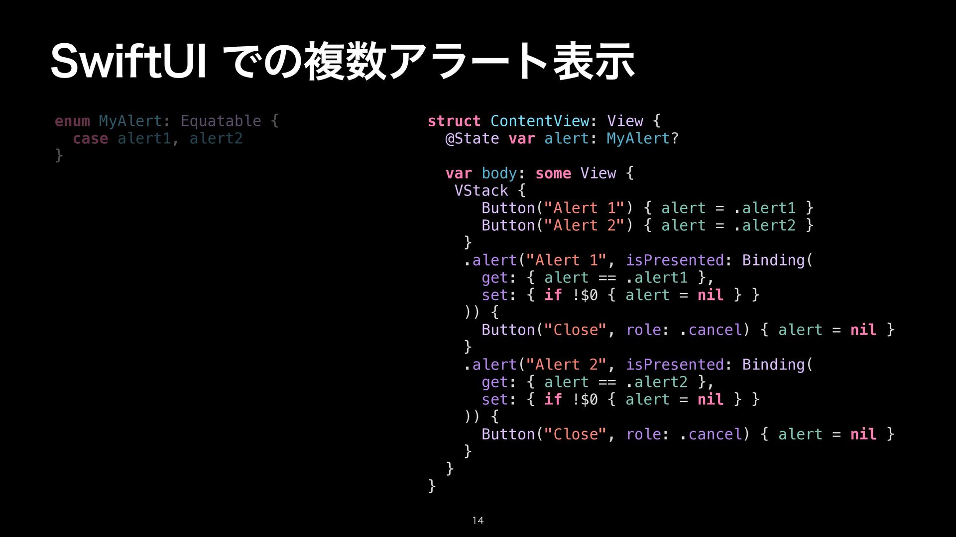 = .dismissed var body: some View { VStack { Button("Alert 1") { alertState = .presenting(.alert1) } Button("Alert 2") { alertState = .presenting(.alert2) } } .alert("Alert 1", isPresented: Binding( get: { alertState == .presenting(.alert1) }, set: { if !$0 { alertState = .dismissed } } )) { Button("Close", role: .cancel) { alertState = .dismissed } } .alert("Alert 2", isPresented: Binding( get: { alertState == .presenting(.alert2) }, set: { if !$0 { alertState = .dismissed } } )) { Button("Close", role: .cancel) { alertState = .dismissed } } } } enum MyAlert: Equatable { case alert1, alert2 } 0QUJPOBMͷΘΓʹ Ξϥʔτͷදࣔঢ়ଶΛ ද͢ઐ༻ͷܕΛ༻ҙ enum AlertState<Alert> where Alert: Equatable { case dismissed case presenting(Alert) } w 0QUJPOBMͷҥߏจ͕͑ͳ ͍ͷͰهड़ྔ૿͑Δ w จ຺ΘΓ͘͢ͳͬͨ