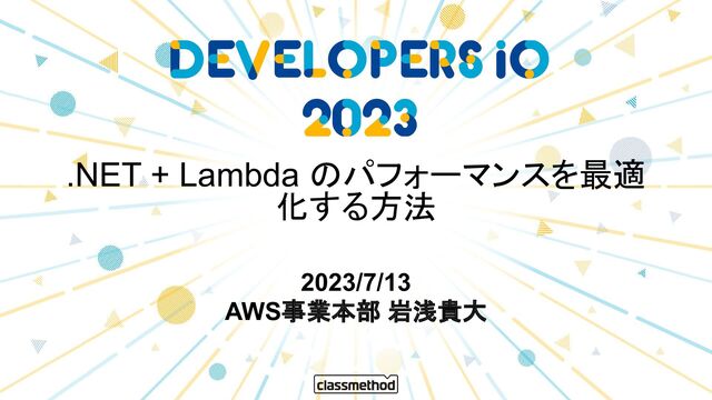 .NET + Lambda のパフォーマンスを最適 化する方法 2023/7/13 AWS事業本部 岩浅貴大