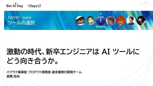 激動の時代、新卒エンジニアは AI ツールに どう向き合うか。 バクラク事業部 プロダクト開発部 請求書発行開発チーム 高橋 拓也 TAKAHASHI,