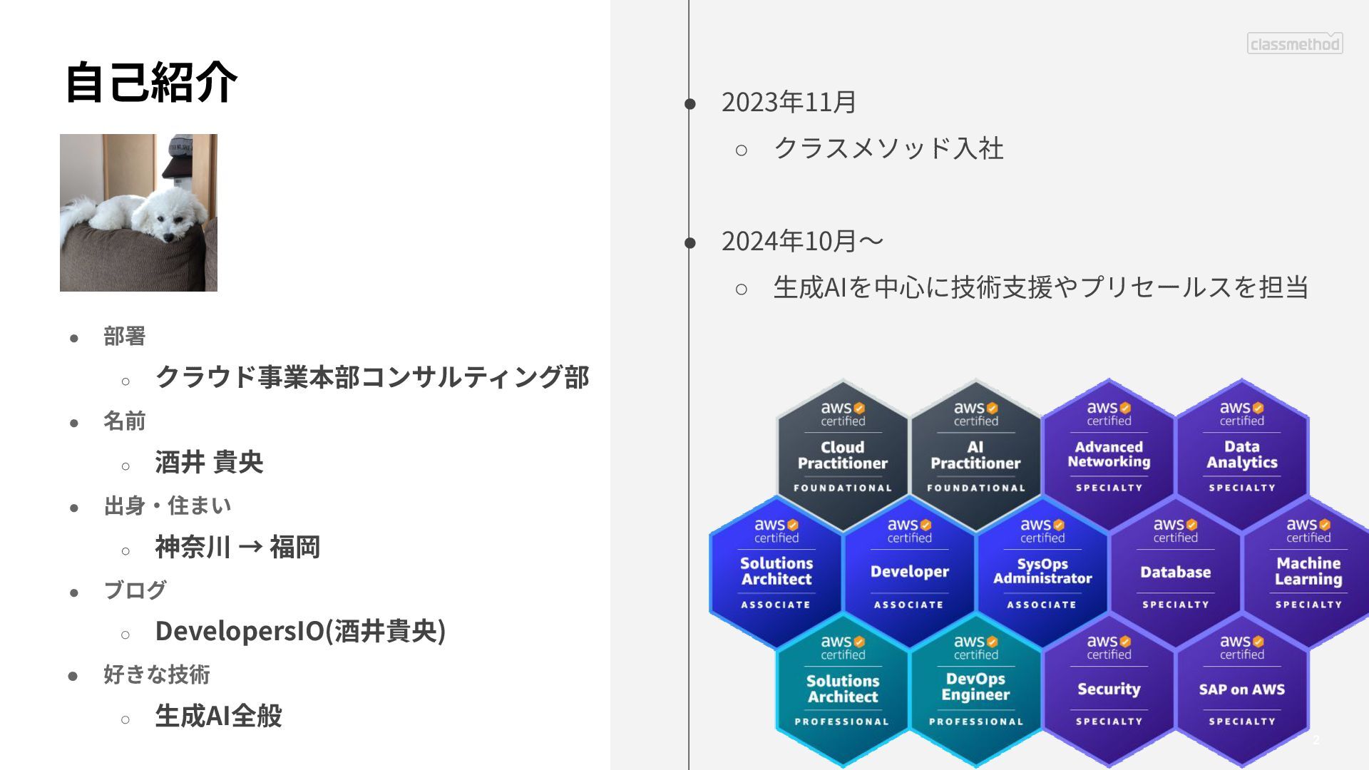 • 部署 ◦ クラウド事業本部コンサルティング部 • 名前 ◦ 酒井 貴央 • 出⾝‧住まい ◦ 神奈川 → 福岡 • ブログ ◦ DevelopersIO(酒井貴央) • 好きな技術 ◦ ⽣成AI全般