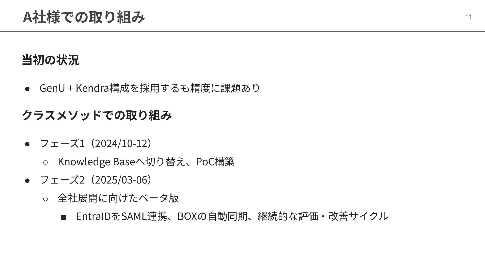 A社様での取り組み 11 当初の状況 • GenU + Kendra構成を採⽤するも精度に課題あり クラスメソッドでの取り組み • フェーズ1(2024/10-12)