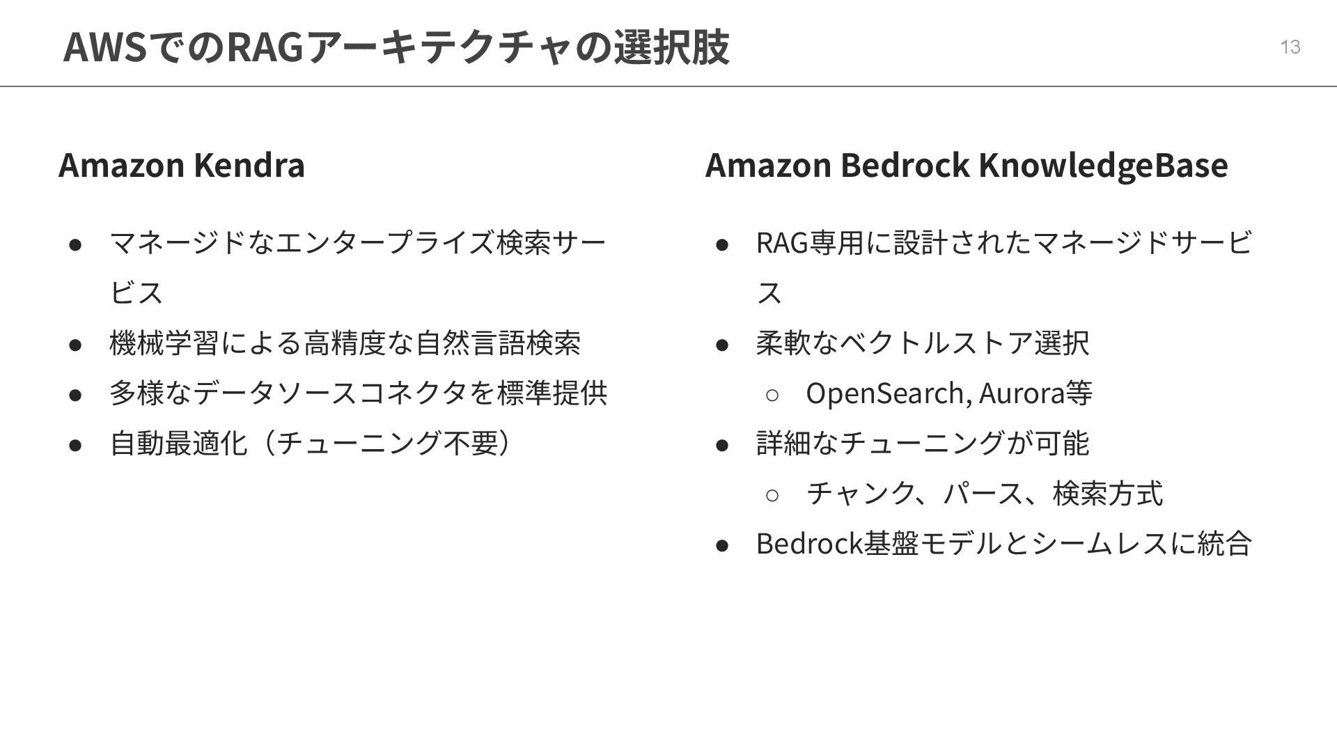 多様なデータソースコネクタを標準提供 • ⾃動最適化(チューニング不要) Amazon Bedrock KnowledgeBase • RAG専⽤に設計されたマネージドサービ ス • 柔軟なベクトルストア選択 ◦ OpenSearch, Aurora等 • 詳細なチューニングが可能 ◦ チャンク、パース、検索⽅式 • Bedrock基盤モデルとシームレスに統合