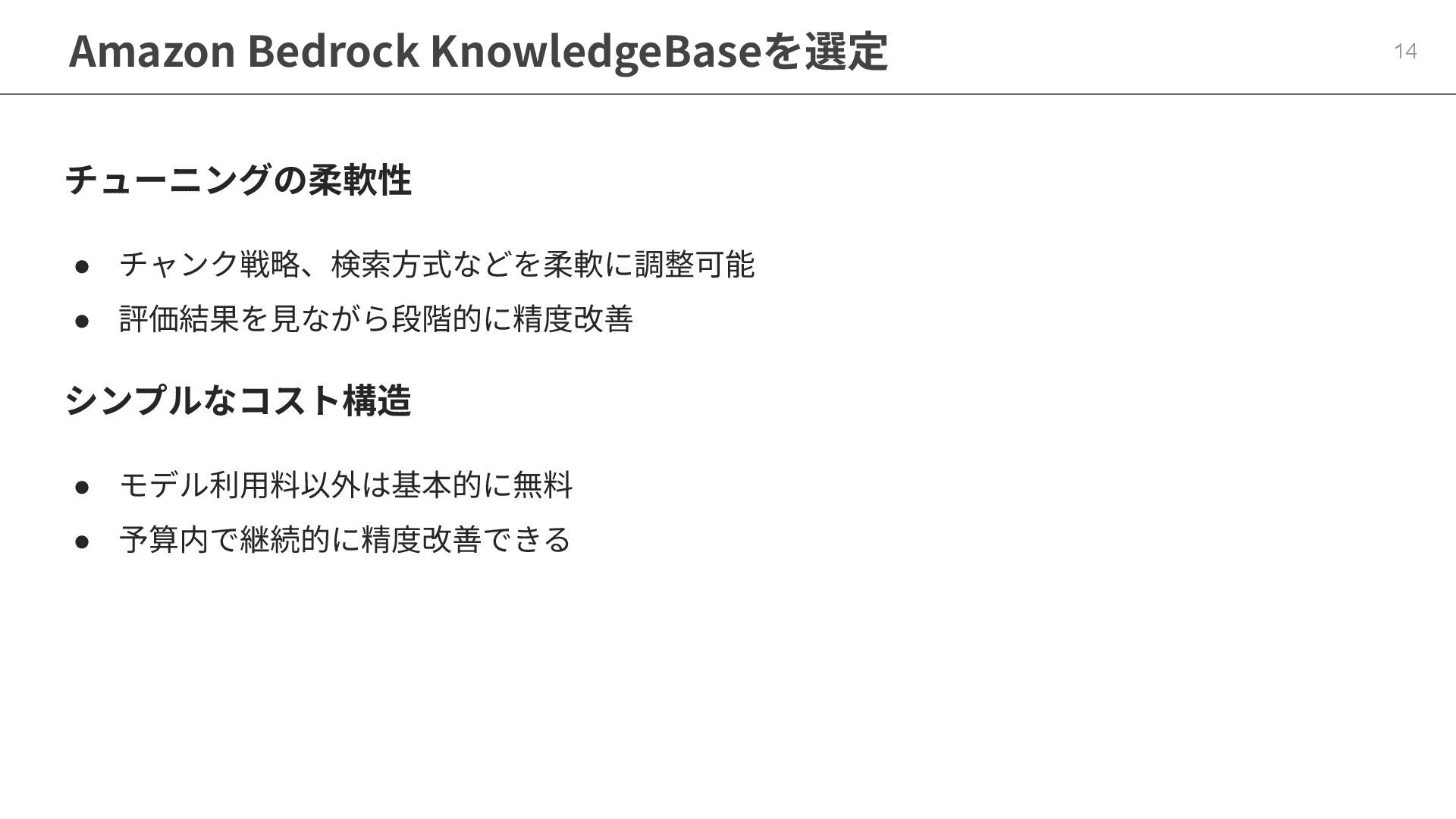 Amazon Bedrock KnowledgeBaseを選定 14 チューニングの柔軟性 • チャンク戦略、検索⽅式などを柔軟に調整可能 • 評価結果を⾒ながら段階的に精度改善 シンプルなコスト構造