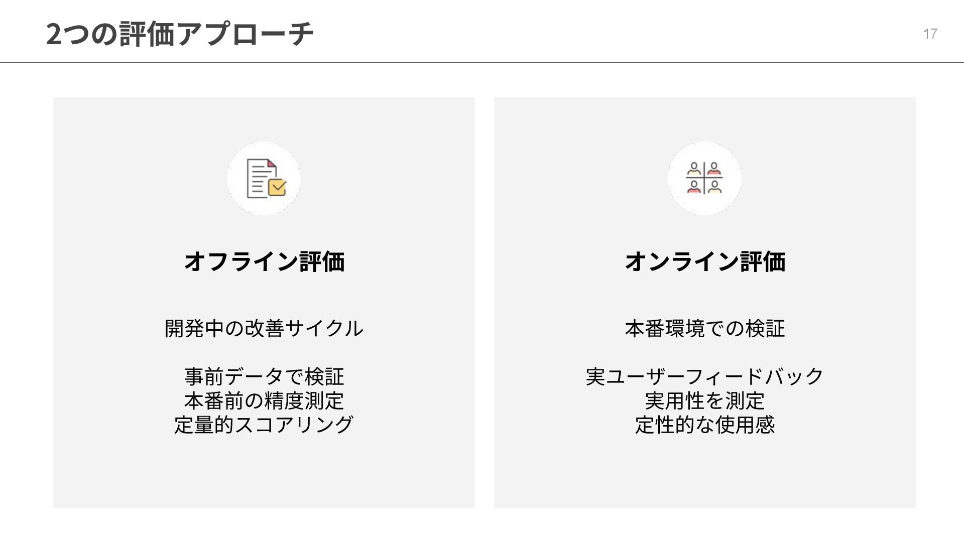 ◦ オフライン/オンライン評価で問題を可視化 3. 改善 ◦ データ品質の向上を軸に段階的に対応