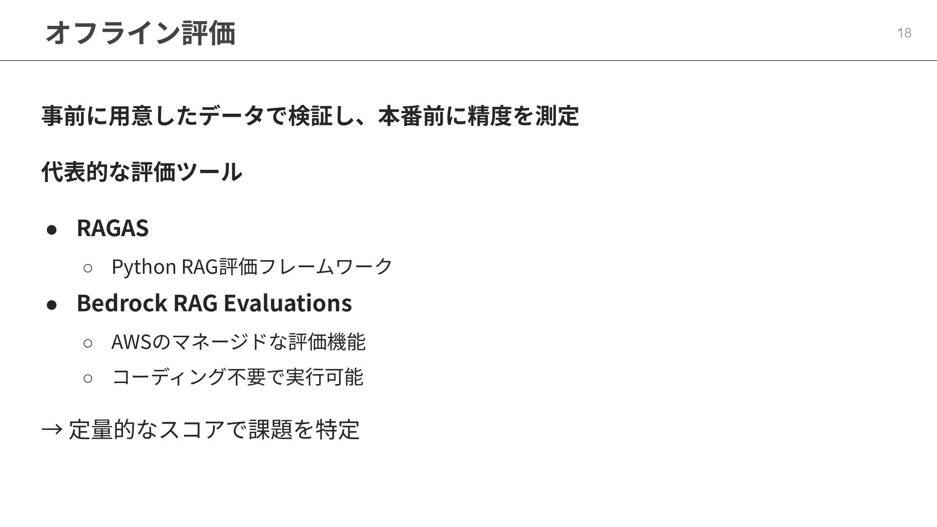 2つの評価アプローチ 17 オフライン評価 開発中の改善サイクル 事前データで検証 本番前の精度測定 定量的スコアリング オンライン評価 本番環境での検証 実ユーザーフィードバック