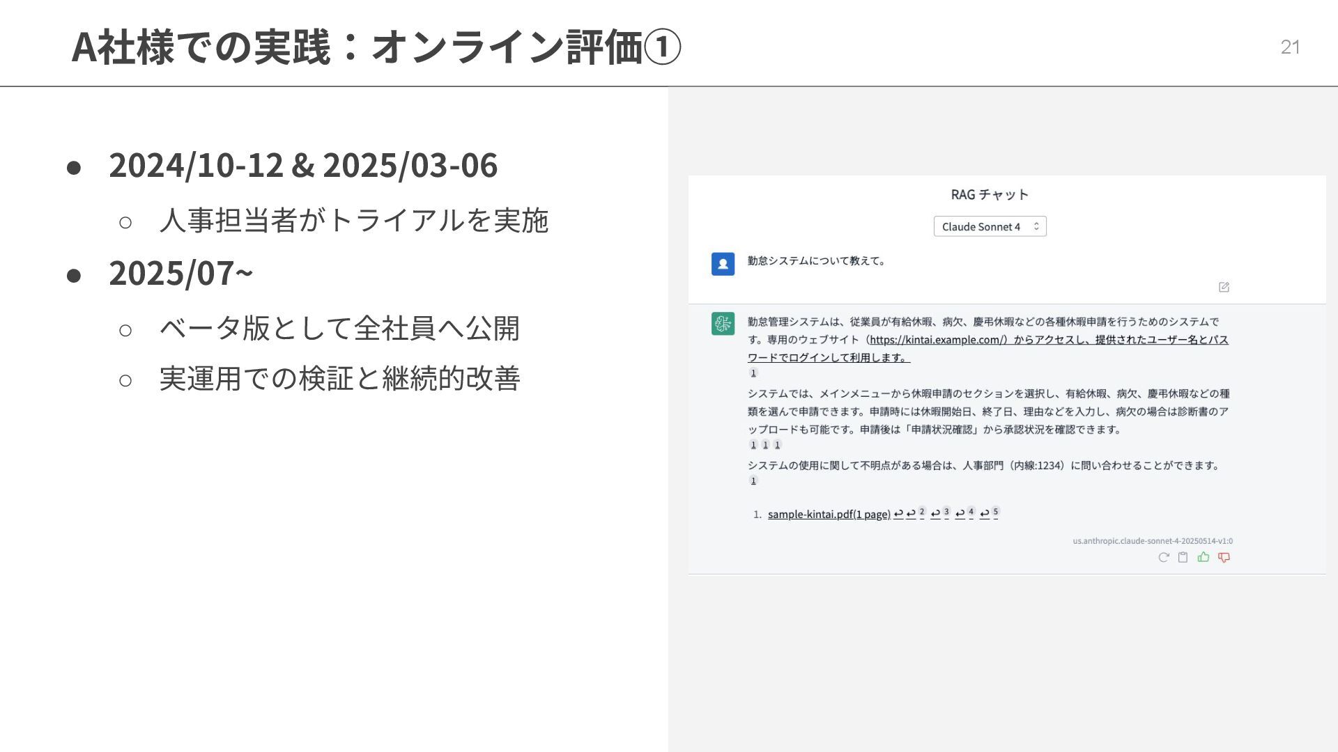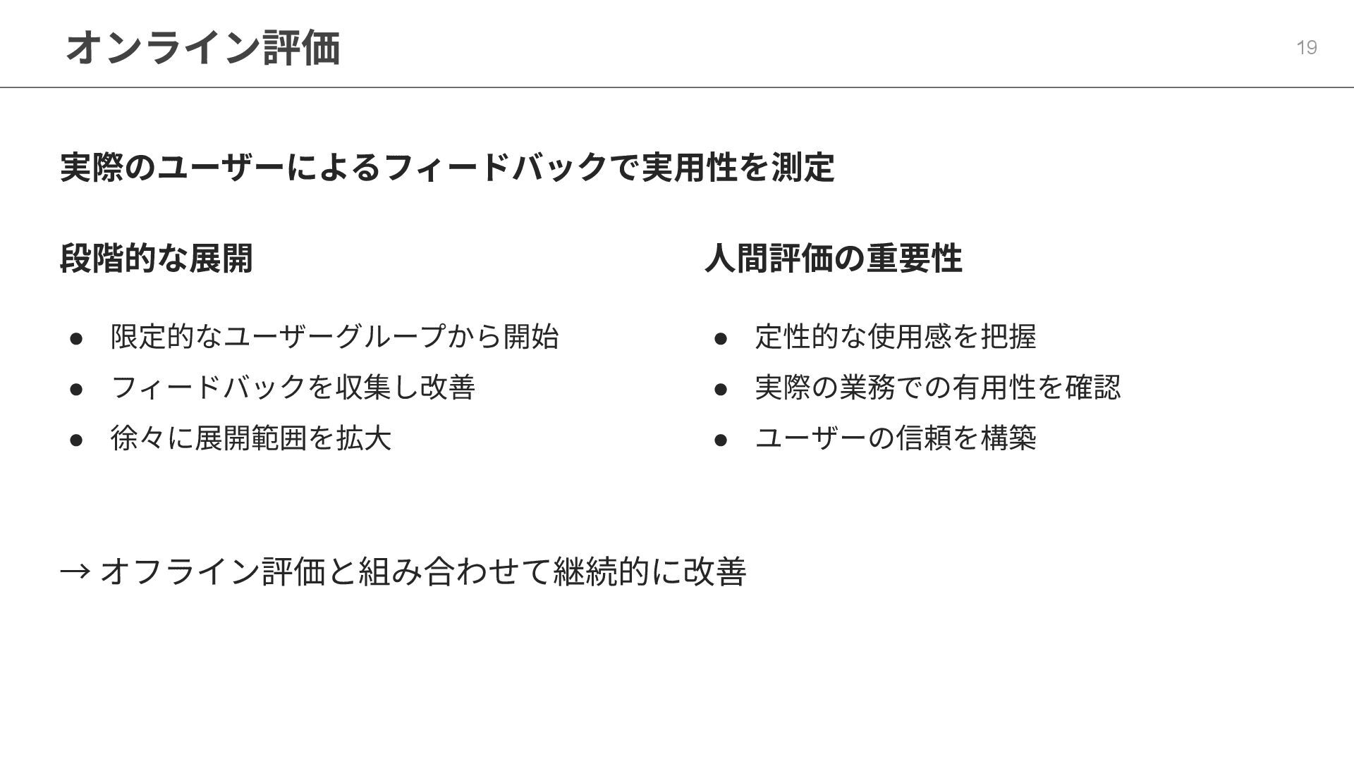 オンライン評価 19 実際のユーザーによるフィードバックで実⽤性を測定 → オフライン評価と組み合わせて継続的に改善 段階的な展開 • 限定的なユーザーグループから開始 • フィードバックを収集し改善