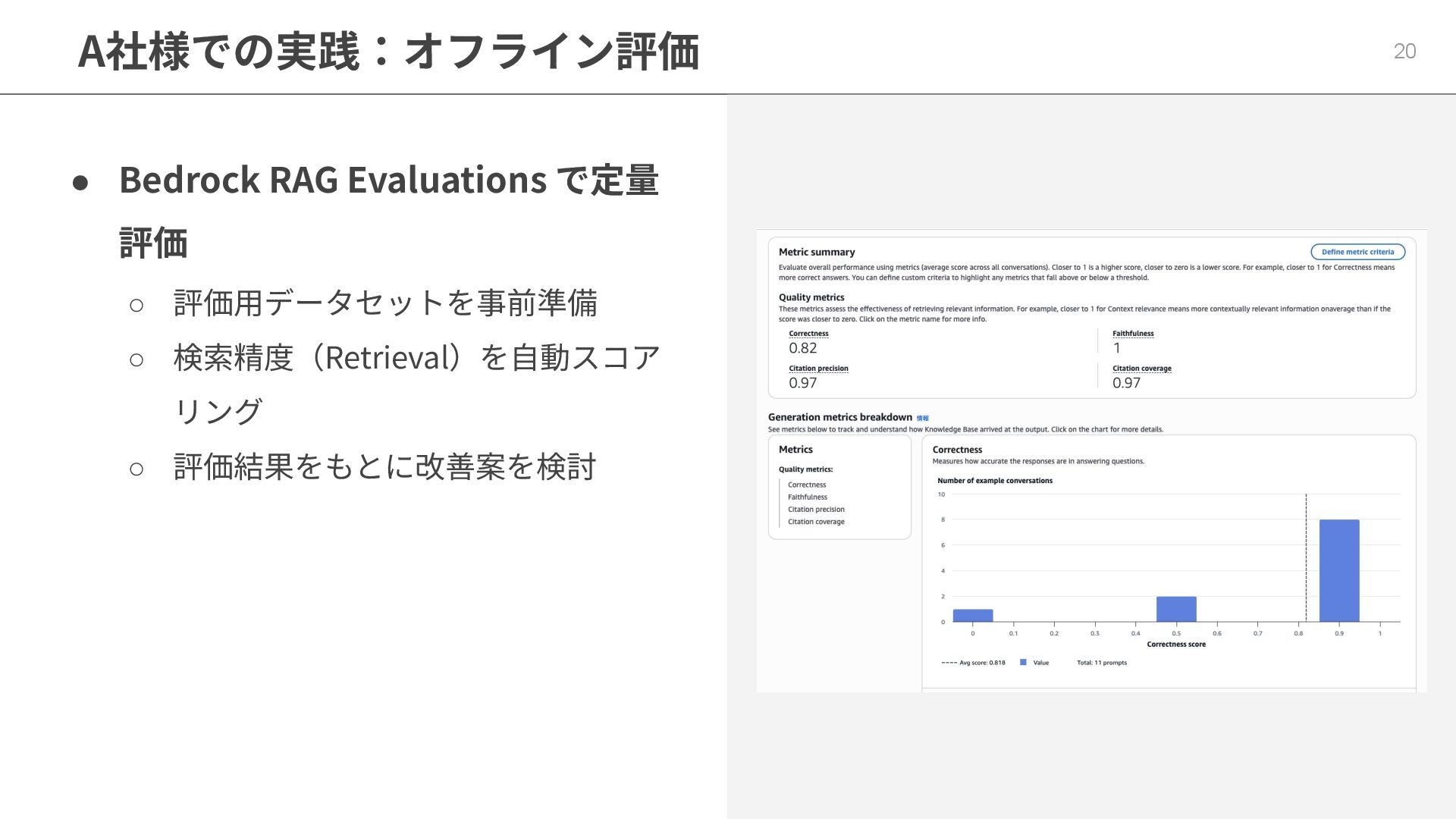A社様での実践:オフライン評価 20 • Bedrock RAG Evaluations で定量 評価 ◦ 評価⽤データセットを事前準備