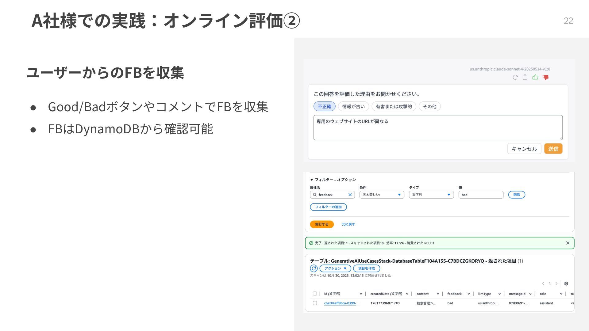 A社様での実践:オンライン評価② 22 ユーザーからのFBを収集 • Good/BadボタンやコメントでFBを収集 • FBはDynamoDBから確認可能