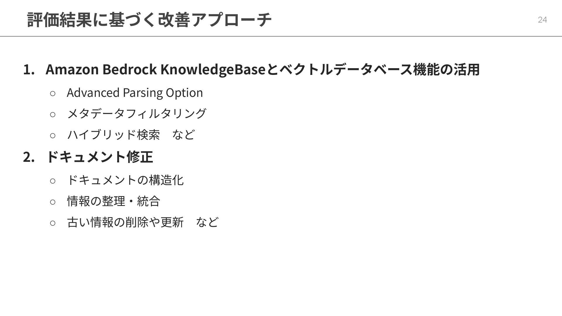 ◦ メタデータフィルタリング ◦ ハイブリッド検索 など 2. ドキュメント修正 ◦ ドキュメントの構造化 ◦ 情報の整理‧統合 ◦ 古い情報の削除や更新 など